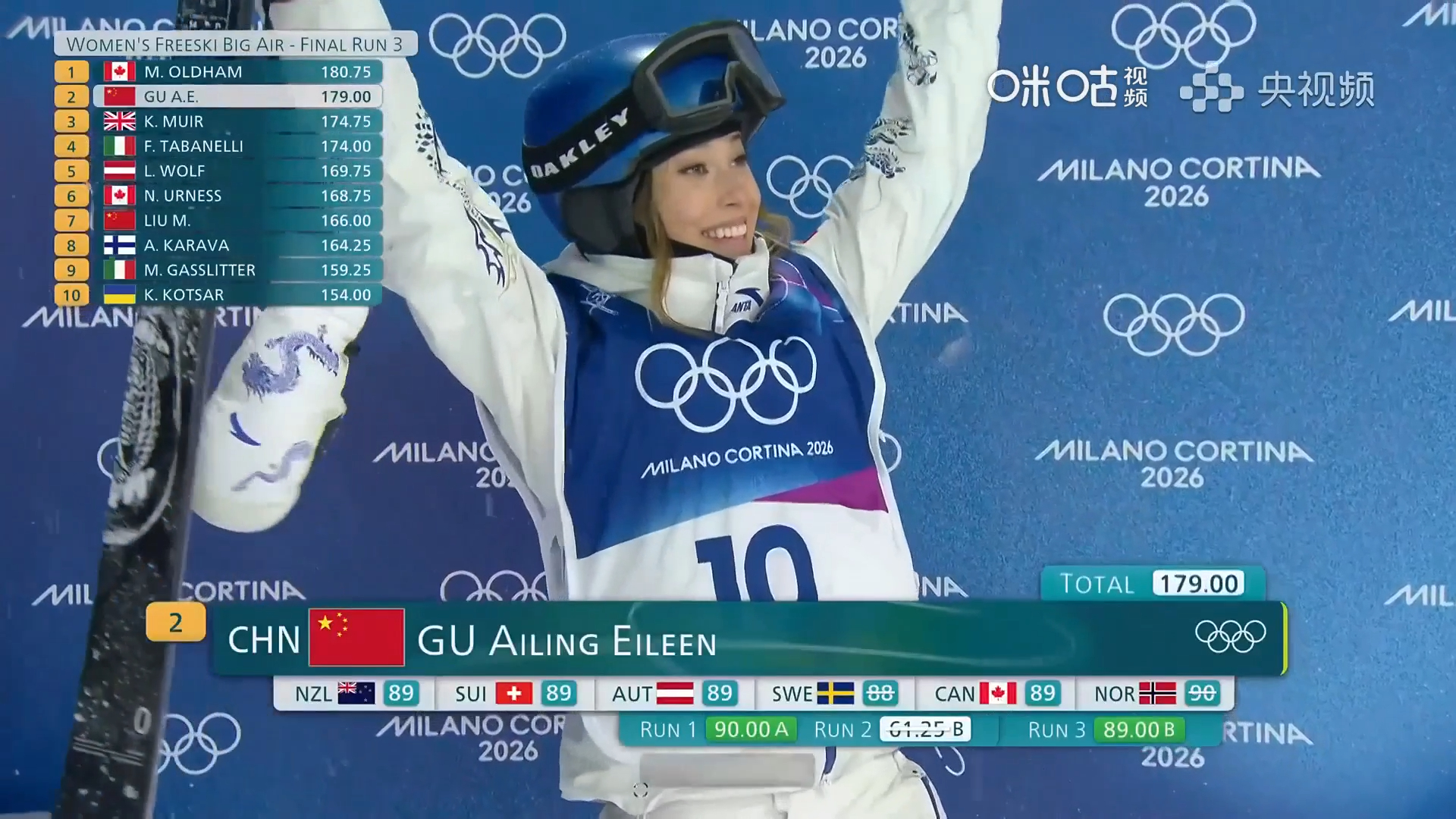 米兰冬奥会自由式滑雪女子大跳台决赛,谷爱凌第三跳顶住压力成功完成,得到89.00分的高分,总分179.00分,暂列第二,表现已经非常棒了。