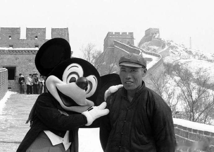 1985,春节,一名男子在长城上和米老鼠合影
