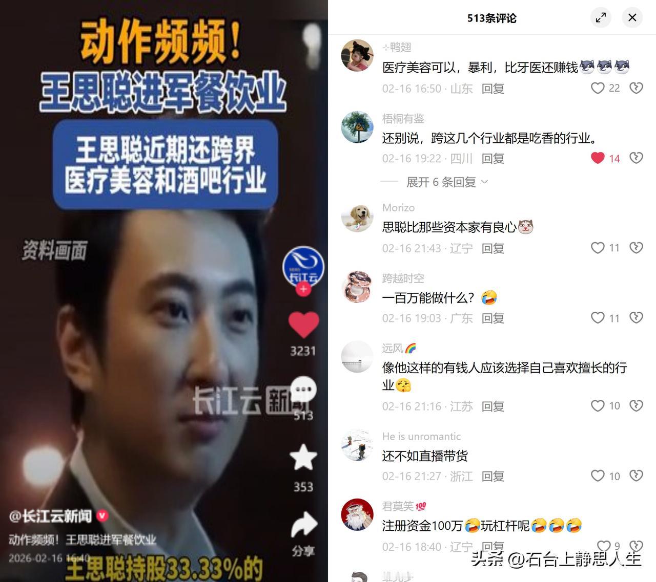 王思聪再出手,100万布局餐饮管理 近期他动作频繁,先碰医美、酒吧,2月9日又间接持股成立了北京与雾餐饮管理公司。 这是家管理型公司,不是开实体店那种,100万是认缴注册资本,不是真掏这么多启动。 说穿了,这哪是什么屡败屡战的创业?根本是资本盯着暴利赛道的精准围猎。 医美、餐饮都是公认的低门槛高回报行当,选这些赛道,本身就是稳赚不赔的算计。 别纠结100万够不够开餐厅,谁告诉你这钱是用来开实体店的? 认缴制就是资本降成本的套路,先搭个管理框架,后续靠实缴、杠杆、资源就能把盘子铺大。 咱们普通人开个小餐馆,得砸几十万装修进货,人家只需要用100万的壳,就能撬动供应链、外卖平台的资源。 有人说医美比牙医还暴利,真没说错。也有人疑惑100万能做什么?那是没看懂资本的潜规则。 选赛道看暴利属性,降成本靠认缴+杠杆,这玩法跟咱们老百姓的创业,根本不在一个维度。 不得不说,资本的嗅觉和操作,普通人真的望尘莫及。 你看懂这波资本游戏里的门道了吗?