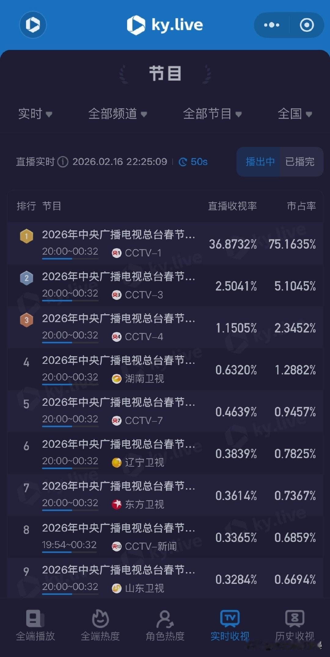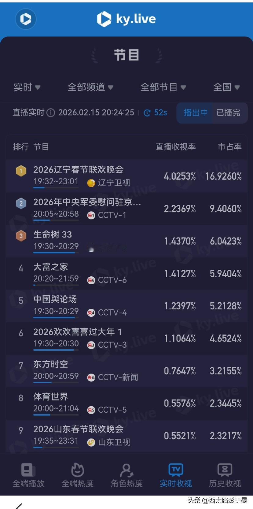 春晚收视“铁三角”稳了!辽宁卫视三连冠,总台春晚依旧是顶流 最近几年的卫视春晚收视数据出炉,看完只有一个感觉:有些地位,真的很难撼动! 先说省级卫视这边,辽宁卫视春晚简直是“收视常青树”。从2023到2025年,连续三年拿下省级卫视收视冠军,2025年平均收视率直接飙到3.39%,峰值更是突破4%,把其他卫视远远甩在身后。北京卫视、湖南卫视紧随其后,常年稳居第二、三位,形成了稳固的“头部铁三角”。 再看2026年总台春晚的实时数据,更是让人惊叹。CCTV-1直播收视率高达36.87%,市占率超过75%,几乎承包了大年夜的电视屏幕。就算是其他频道和省级卫视转播,也能轻松拿下不错的收视,比如湖南卫视、辽宁卫视的转播收视率都在0.3%以上。 有人说现在大家都刷手机不看电视了,但从数据看,春晚依然是国民级的文化仪式。不管是辽视的接地气,还是总台的大场面,都牢牢抓住了观众的目光。 今年你守着电视看春晚了吗?最喜欢哪个节目?评论区聊聊~