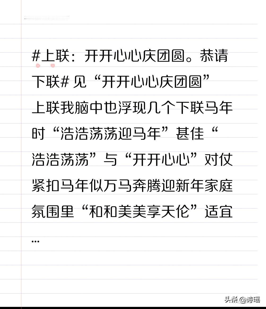 见“开开心心庆团圆”上联 我脑中也浮现几个下联 马年时 “浩浩荡荡迎马年”甚佳 “浩浩荡荡”与“开开心心”对仗 紧扣马年 似万马奔腾迎新年 家庭氛围里 “和和美美享天伦”适宜 家人团圆享天伦 温馨满溢 职场人用 “顺顺当当创辉煌”不错 盼新年顺遂 寓事业有成 年轻朋友发圈 “岁岁年年共清欢”文艺 有岁月静好之感 哪个下联更妙呢?