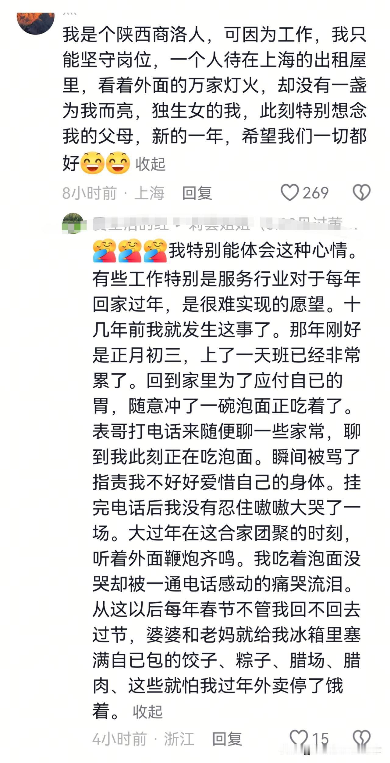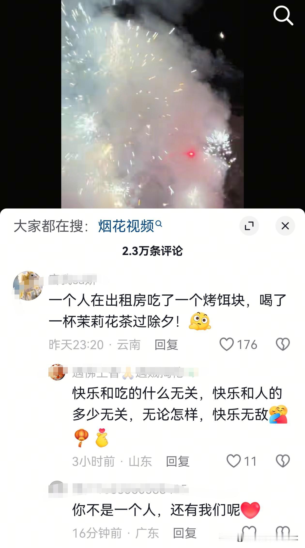 宇辉在除夕夜更新视频, 只有烟花和祝福, 我却在他的评论区看到了人情冷暖,看到了人生百态,看到了同频的人互相鼓励与关爱。 有人说:“一个人在出租房吃了一个烤饵块,喝了一杯茉莉花茶过除夕!” 网友回复——“快乐和吃的什么无关,快乐和人的多少无关,无论怎样,快乐无敌”,“你不是一个人,还有我们。” 有人因为工作无法和家人过年,有人跨越千里只为离宇辉更近一点,还有人晒出年夜饭,有人送出新春祝福。 因为宇辉,大家彼此像值得信赖的朋友,在他的评论区安心表达,彼此宽慰,有人懂你的不易,也有人接住你的情绪。 宇辉似乎什么也没做,但又好像做了很多,他让一群原本陌生的人,在彼此的陪伴里,找到了回家的感觉。