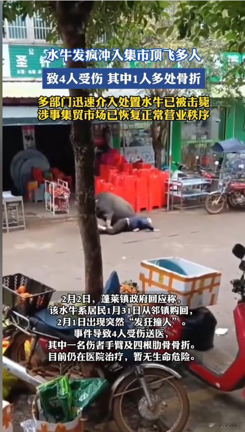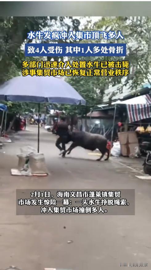 “太吓人了!”近日,海南,一男子在集市上闲逛时,突然被冲出的一只水牛撞到在地,男子顿时感到一阵疼痛,而后发现水牛发疯的似的在集市上横冲乱撞,又撞倒三人。就医检查后,男子被诊断为手臂及肋骨骨折。网友:简直是飞来横祸! 临近过年,农村集市很是热闹。家家户户都会赶集市囤年货。但也因为人员密集,一旦出现牲畜失控的情况,很容易造成意外伤亡。 据媒体2月2日报道,事发当天,男子到集市上买东西。而集市这时也正处于人流高峰,一头水牛突然挣脱缰绳,发疯似的冲向人群。 男子这时并没有发现,当他走到一十字路口时,水牛突然从他的右手边的巷子里冲出来,直接将他顶翻在地。男子顿时感到手臂和胸口处传来撕裂的痛感,疼得直接起不来。 而后水牛更是开始横冲直撞,接连顶飞多名来不及躲避的路人,冲撞的速度极快,人们根本来不及反应,现场顿时一片混乱,尖叫声和哭喊声交织在一起。 当地镇政府工作人员接到消息后迅速赶到现场,对水牛进行控制。随后急救人员将伤者送往医院,目前所有伤者暂无生命危险。 网友表示,谁能想到赶集还能撞上发疯的水牛,这个水牛主人要进行赔偿吧?监管不力,没有牵好牛。也有人表示,在人在人员密集场所,牲畜的看管绝不能松懈,无论是养殖户还是市场管理者,都要把安全放在第一位。 信息来源:《海南文昌一水牛发疯撞人致4伤,有人被顶飞,多部门介入,水牛被击毙》观察者网