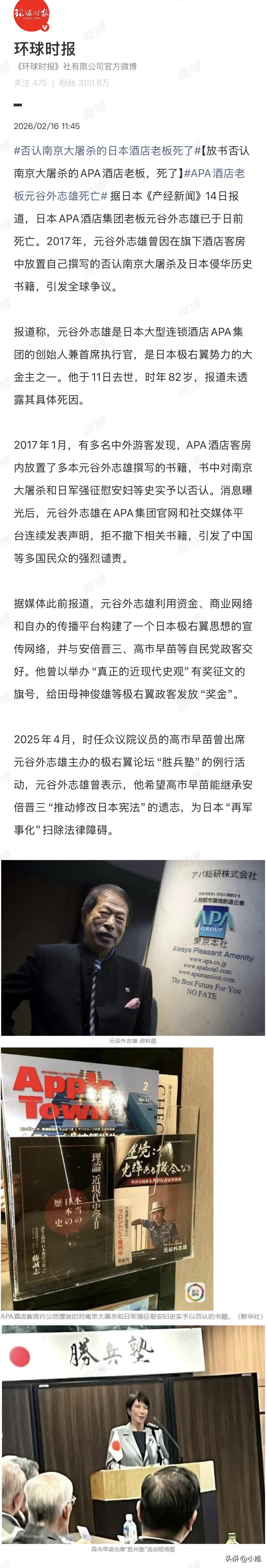 破防了。那个在酒店房间放书、死活不承认南京大屠杀的日本老板,死了。 2月11号,APA酒店创始人元谷外志雄去世,82岁。日本媒体14号才把这消息放出来。 这人死了,但很多人忘不了他干过的事。 2017年1月,有游客住进APA酒店,发现客房抽屉里摆着几本书。翻开一看,写的全是歪曲历史的东西。说南京大屠杀是“捏造的”,说“慰安妇”不是被强迫的,说日本军队只是“处死便衣士兵”。 书是他自己写的,用笔名“藤诚志”。 事情曝光后,中国民众怒了,国家旅游局直接交涉,要求撤书。全球舆论也炸了。 他咋回应的。 拒不撤书。还公开叫嚣,中国人就算预定也不接单。 这话当时气得多少人睡不着觉。 后来有人扒出来,这人不只是个开酒店的。他是日本极右翼势力的大金主,跟安倍晋三、高市早苗这帮政客关系铁得很。 他是安倍后援会“安晋会”的副会长。家里每月办一次品酒会,请的都是政界高层、自卫队的人。 他还搞了个“胜兵塾”,专门网罗右翼文人和政客,当自己的宣传阵地。搞征文比赛,给美化侵略历史的人发奖金。有个叫田母神俊雄的右翼政客,写篇《日本曾是侵略国家吗》就拿走300万日元。 这套玩法,钱花得值。 直到去年4月,他还活跃着。2025年,他主办的“胜兵塾”活动,请来了高市早苗。他在台上说,希望高市早苗能继承安倍晋三的遗志,推动修改宪法,为日本“再军事化”扫清障碍。 那时候他81岁,还在使劲。 这人一辈子,一边盖酒店挣钱,一边写书骂人。酒店开了多少家,日本到处都是。书放了多少本,每间客房一套。客人住进去,拉开抽屉就能看见。 他不觉得自己有错。 他在书里写,日本必须强大,不能有污点。所以那些事不能承认,承认了就是污点。 这逻辑,听完只能沉默。 现在他死了。2月11号走的,家人办了葬礼,只有近亲参加。日本媒体《产经新闻》发讣告,把他吹成“致力于培养具有正确历史观和爱国情怀的日本人”。 你看完这事啥感觉。 有些账,人死了是不是就一笔勾销了。 评论区聊聊。