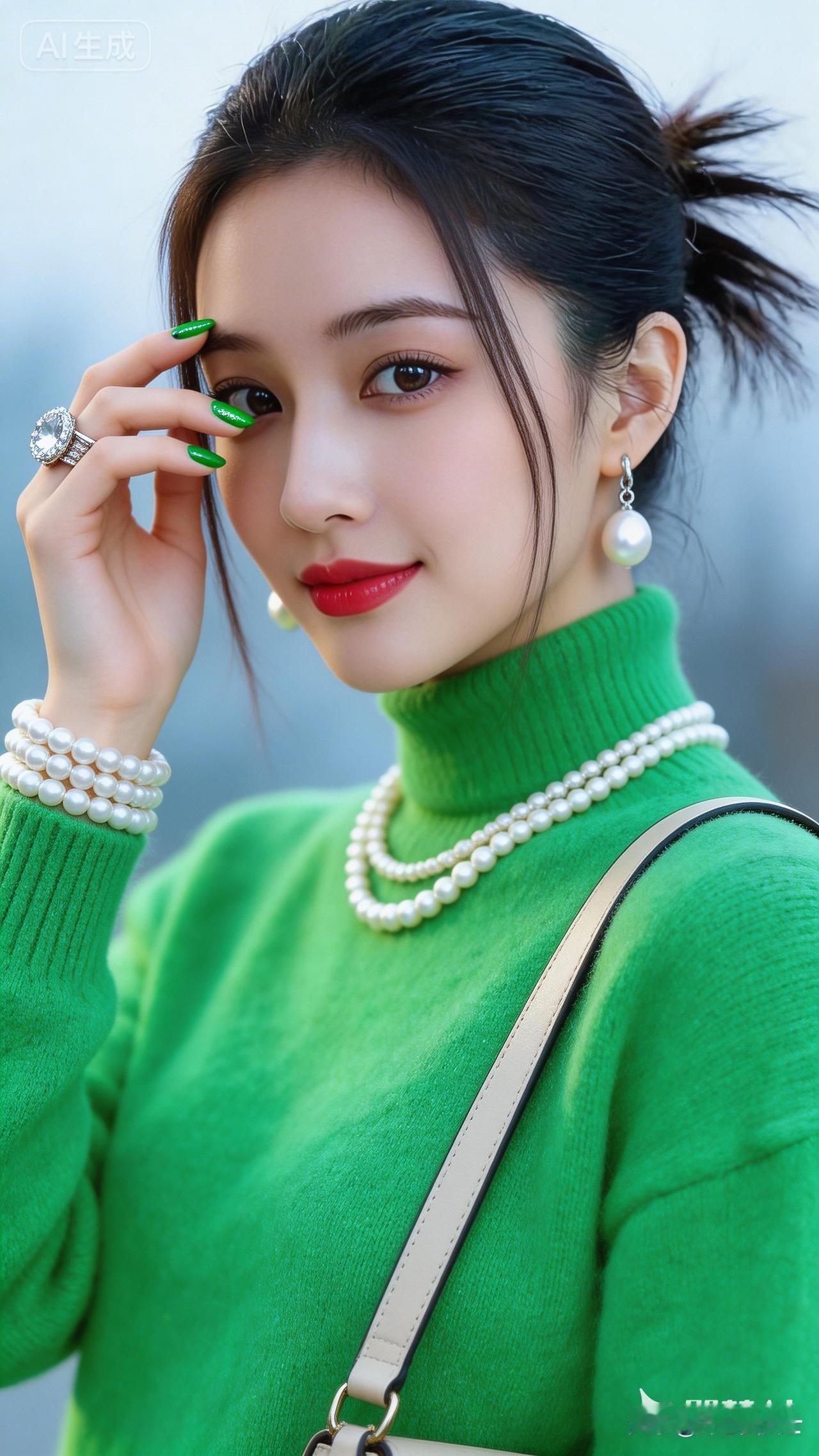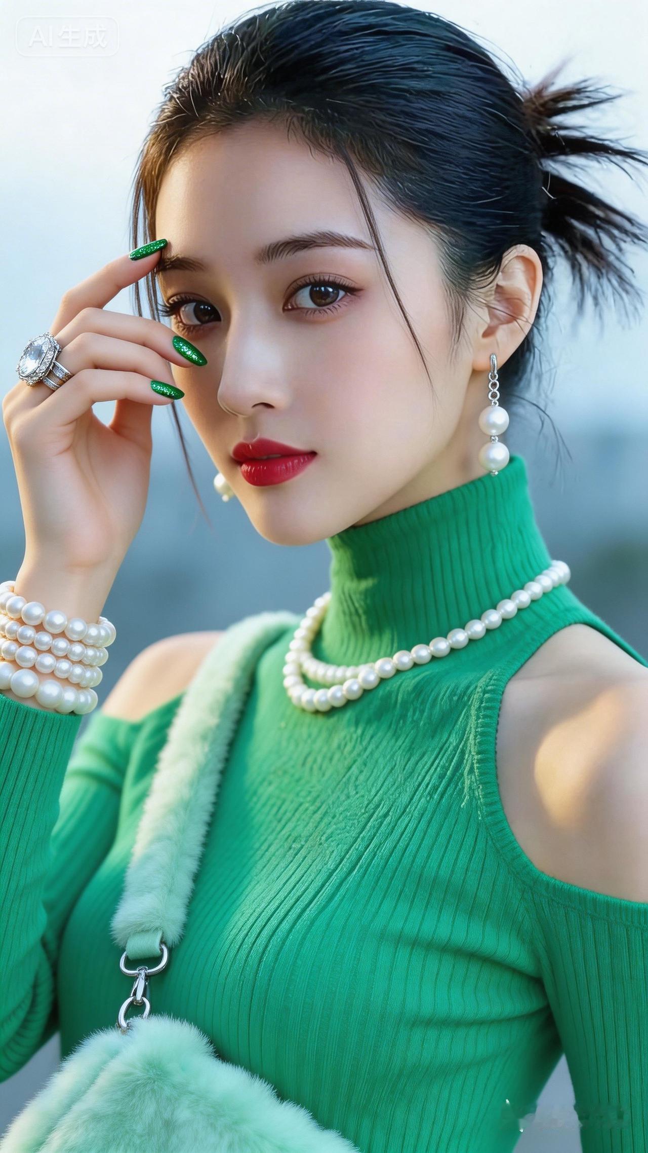 优雅珍珠配饰,绿衣少女,时尚穿搭