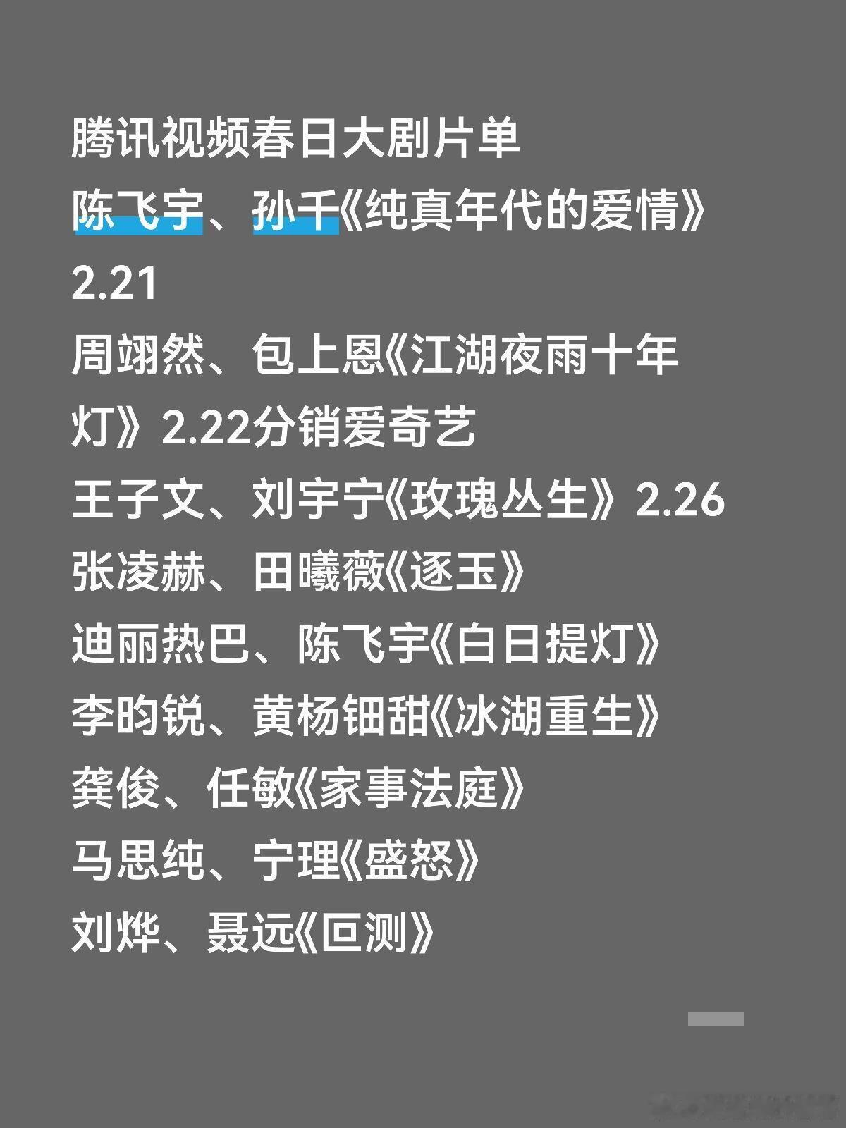 🐧腾讯视频春日大剧片单陈飞宇、孙千《纯真年代的爱情》2.21周翊然、包上恩《江湖夜雨十年灯》2.22分销爱奇艺王子文、刘宇宁《玫瑰丛生》2.26张凌赫、田曦薇《逐玉》迪丽热巴、陈飞宇《白日提灯》李昀锐、黄杨钿甜《冰湖重生》龚俊、任敏《家事法庭》马思纯、宁理《盛怒》刘烨、聂远《叵测》倪妮、闫妮《隐身的名字》张新成、景甜《待我醒来时》钟汉良、朱珠《蜜语纪》许凯、丁勇岱《方圆八百米》