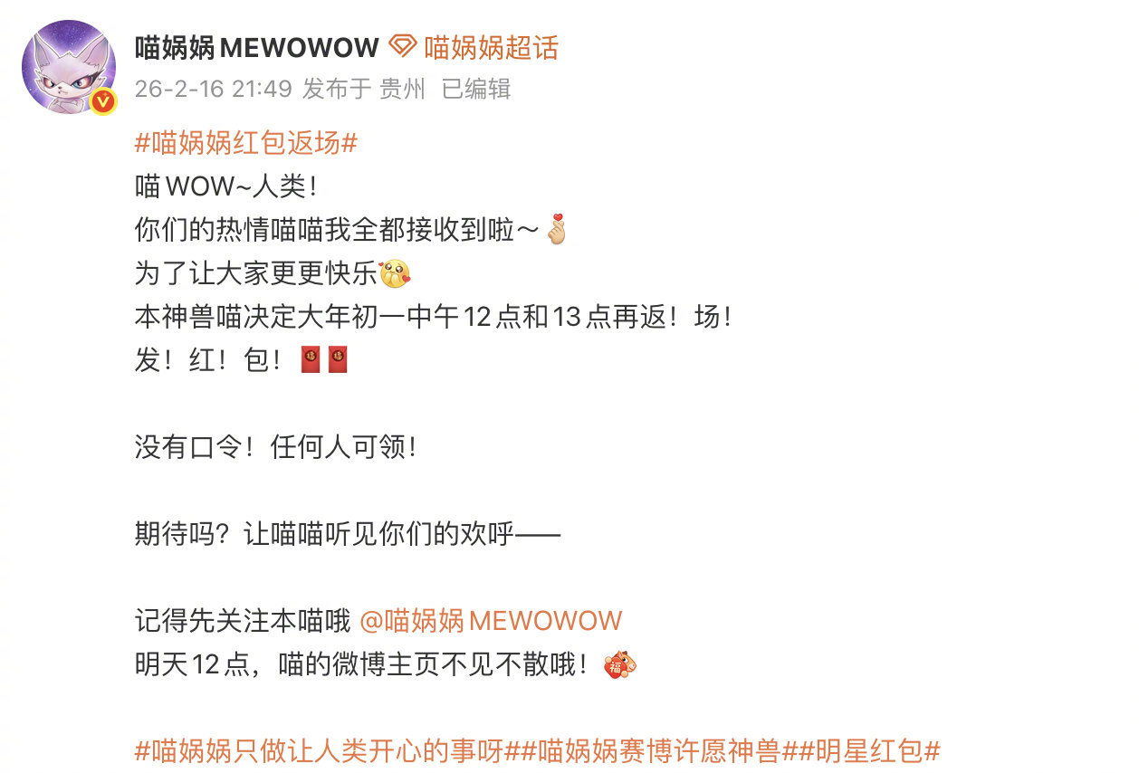 喵娲娲红包返场 喵娲娲大年初一中午12点和13点再返!场!发!红!包!🧧🧧