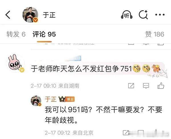 于歪咋大过年的也不消停,人家问他过年怎么不发红包争751,于正问:我可以951吗陈哲远951