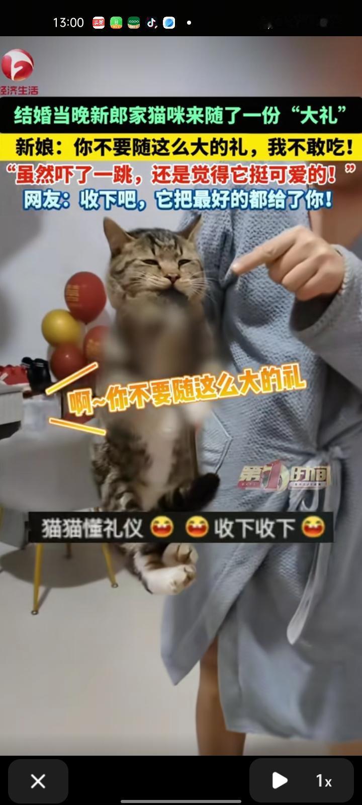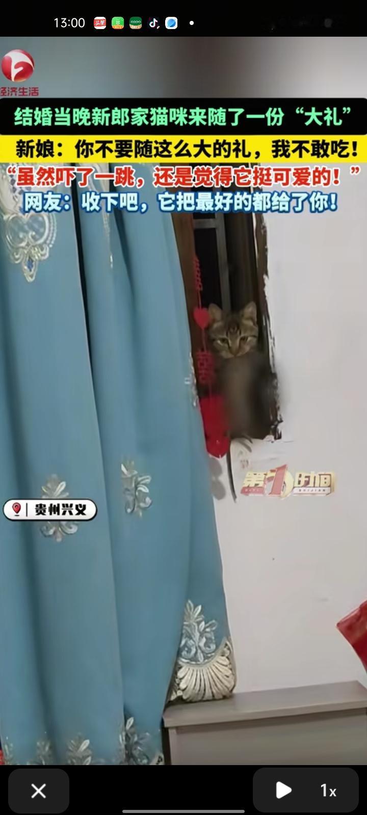 2月9日,黔西南州兴义市。网友发视频称,结婚当晚,自己家猫咪叼来一只老鼠,从窗户进来看着。老公把猫咪抓来随礼,自己被吓坏了,说道:“你不要随这么大的礼,我不敢吃”。 当事人表示,虽然吓了一跳,还是觉得它挺可爱的。