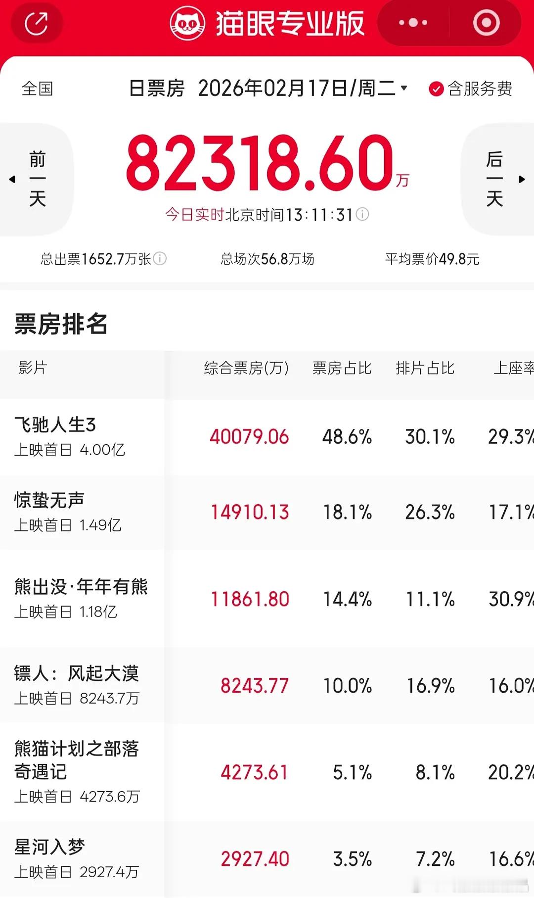 春节档电影第一天,除了飞驰人生和熊出没,其他全倒挂