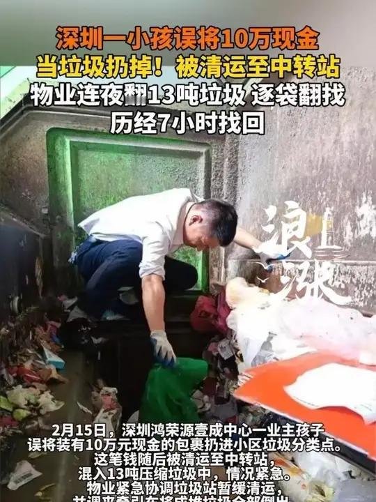 2月15日,深圳鸿荣源壹成中心,业主家孩子一个不留神,把装着10万元现金的包裹丢进了小区垃圾分类点。 (个人观点仅供参考,无任何不良引导) 十万块!业主发现时怕是魂都要飞了。赶紧找物业,物管团队没半分犹豫。主管领着人,一头扎进垃圾山。垃圾成堆,找个包裹堪比海底捞针。七个钟头,从日头正盛到夜色渐浓,没人喊累没人退缩,硬是在腥臭的垃圾堆里,把那笔钱完好无损地找了回来。 “人心齐,泰山移”,这话在这儿见了真章。谁家没点小意外?关键时刻,有人肯为你的急难险重搭把手,哪怕是在污秽里翻找,这份担当比金子还可贵。 物业管的不只是小区大门、楼道卫生。能把业主的事当自家事办,肯下笨功夫啃硬骨头,这样的服务,谁住着不舒心?这世上最暖的,不就是这份把他人难处放在心上的实在劲儿吗? 图片素材来自网络,无任何不良引导