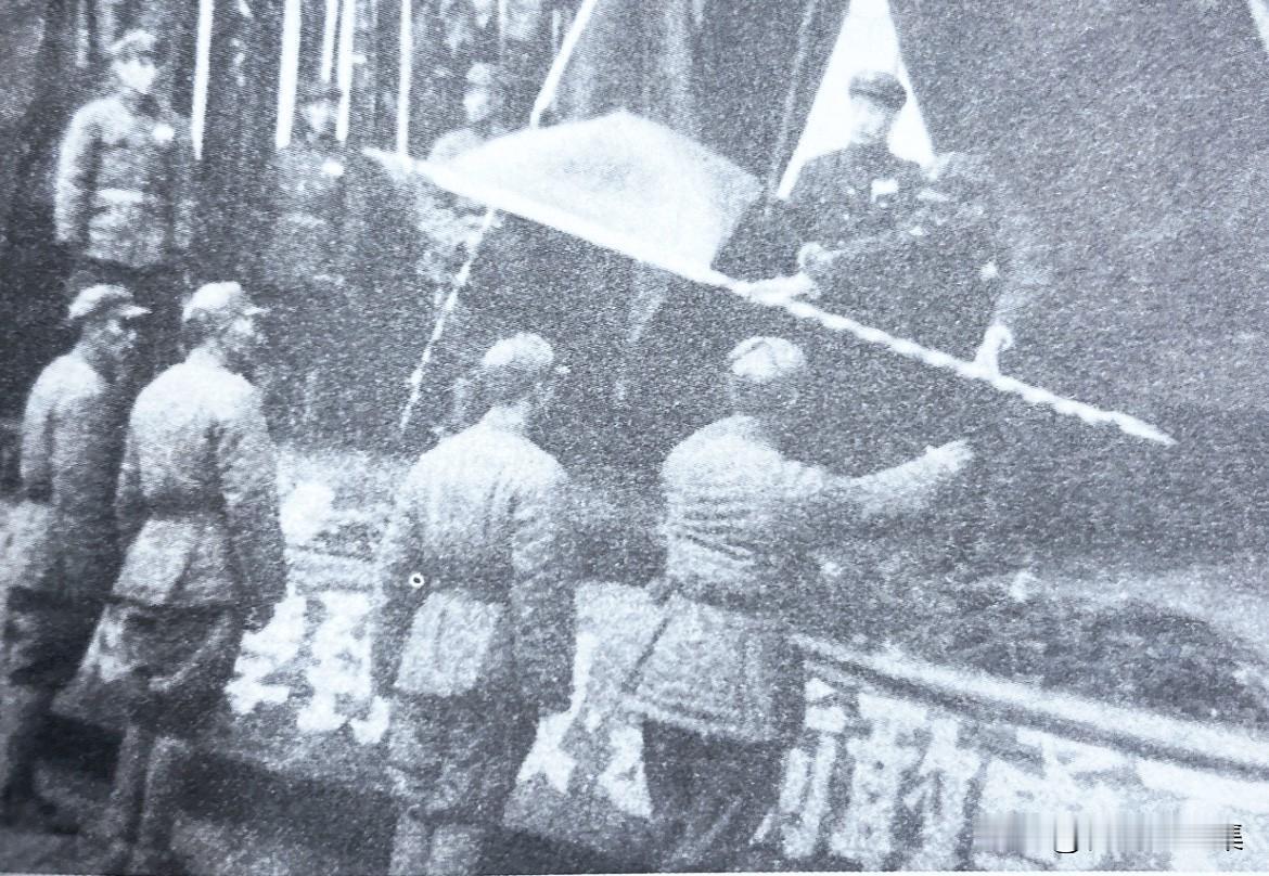 1949年8月4日,国民党元老程潜和长沙“绥靖”公署副主任兼湖南省主席陈明仁,在长沙通电起义。程潜、陈明仁起义部队奉命改编为中国人民解放军第二十一兵团。图是在授旗典礼大会上,第四野战军政治部副主任陶铸在授旗。