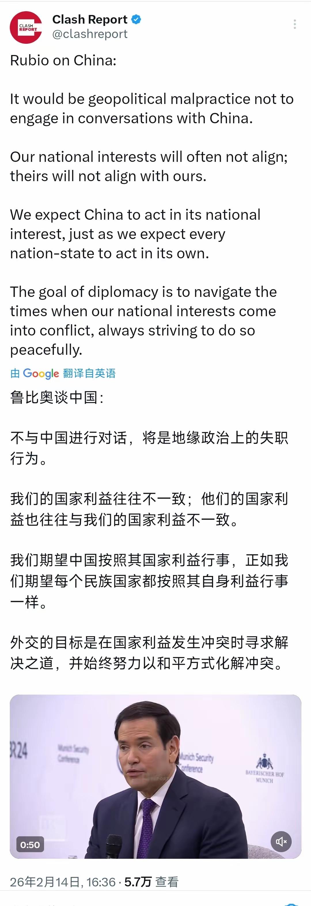 正在访问匈牙利的美国国务卿鲁比奥昨晚(2月16日)表示:“中国是个大国,拥有十多亿人口,是世界第二大经济体,而且拥有核武器。如果美国和中国之间没有关系、没有相互交流,那将是极其疯狂和荒谬的。” 在特朗普总统访华前夕,美国刻意营造两国间“祥和”的气氛,绝非美国对华政策的转向。鲁比奥担任美国议员二十多年,在众多反华议案中,鲁比奥不是提案人就是积极参与者,“反华急先锋”名不虚传,就任国务卿后有所收敛。鲁比奥没想到中国的制造业发展如此之快,没想到中国从价值链低端通过创新走到了价值链甚至供应链的高端,美国同意中国加入世贸组织,希望用资本主义改造中国,没想到中国改造了资本主义。无论鲁比奥现在说什么,但美国的大国竞争战略不会改变,这是美国民主、共和两党达成的少有的重要共识。
