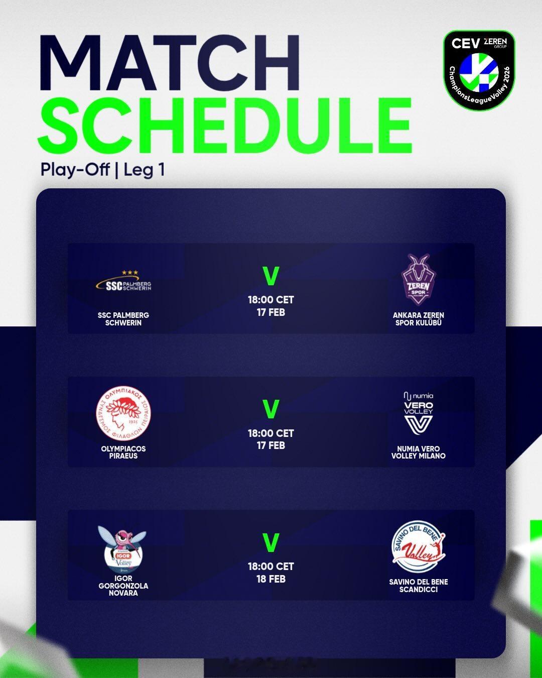 2026女排欧冠 八强附加赛首回合本周竞赛日程(北京时间):