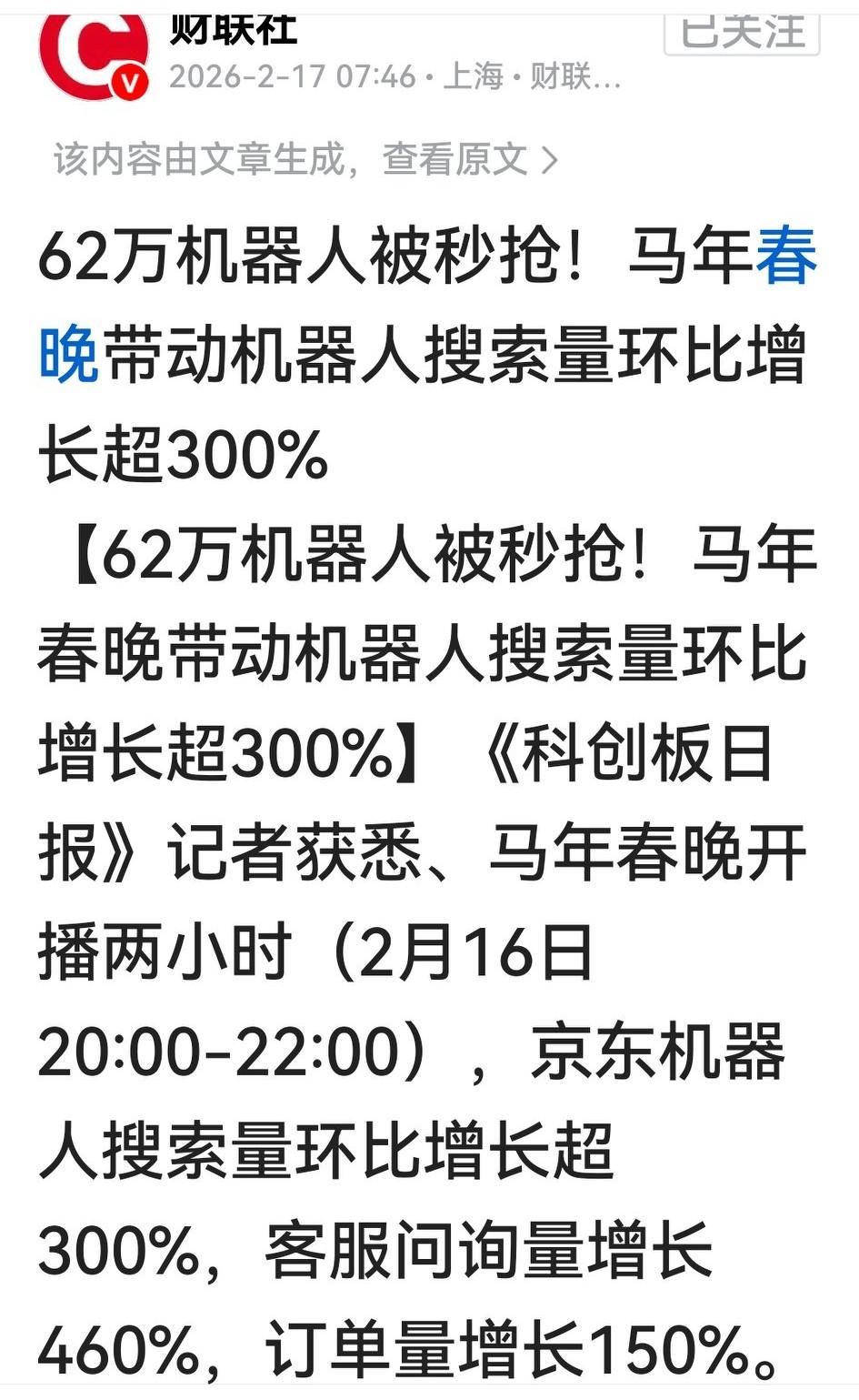 看了春晚后,对机器人高速成长的未来没人再怀疑,唯一有的个股价格翻了数倍,让人恐惧。 但以宇树为例,昨晚20:00~22:00两个小时,京东机器人搜索就涨300%、问询就涨460%、订单就涨150%,具备强大的吸引力。 具身智能机器人是服务人类生产生活的未来产业,只要拿着核心个股再等几年,当下股价再高也无所谓,毕竟还有机会翻数倍。当然,你得认准个股的核心竞争力是否可持续,新兴领域踩雷的风险也挺大的。