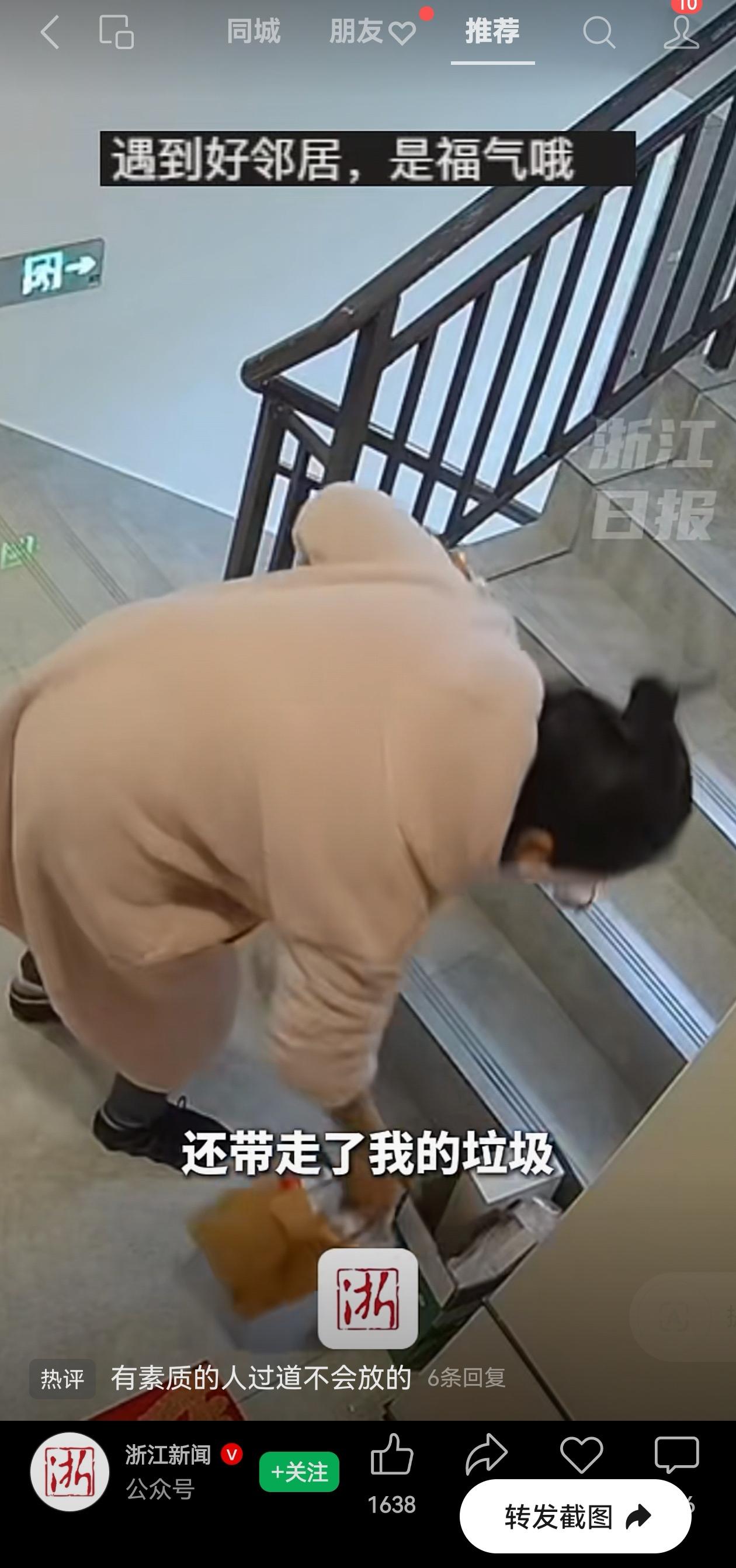 都是讲究人呢!2026年2月17日,四川成都的陈女士被自己的邻居暖了一下。陈女士平时在外地工作,只有放假才回家。 今天她出门晚了,临时把没来得及扔的一小堆垃圾放在楼梯口,结果回来发现,垃圾不见了,原来是对门刚搬来不久的邻居下楼时,顺手把她的垃圾也带走了,尽管当时她手里抱着的垃圾已经满满当当。 就这么一个小动作,陈女士感动得不行,说再也不把垃圾放门口了。 可能谁都有过这种经历:有时候把垃圾放门口,并不是懒,可能就是赶时间,想着回头再处理。 但是毕竟是影响公共环境的行为,多少有点忐忑吧。结果陈女士遇到一个不仅不嫌弃,还顺手帮忙扔掉的邻居,这种被陌生人善待和理解的感觉,让人感动! 更难得的是,这位邻居自己手里本来就拿得满满的。没有想着赶紧搞定自己的事,偏偏多看了和自己无关的垃圾一眼,多伸了一把手。 理解陈女士被善意最打动人的心情,邻居帮忙带垃圾下去丢,不是陈女士求的,也不是必须的,但是邻居看到了,不怕麻烦和不干净,顺手处理了。 陈女士得知邻居顺手扔掉自己的垃圾,没有半点占便宜的窃喜,而是第一时间反省“再也不把垃圾放门口了”。 这就是讲究人。心里装着别人,懂得换位思考,邻居的好意是情分,但不能因此就觉得理所应当。 就这样温暖完成的闭环,邻居用行动释放善意,陈女士用态度承接这份善意。一个愿意伸手,一个懂得自省,这难道不是邻里关系最美的样子吗? 信息来源:浙江新闻
