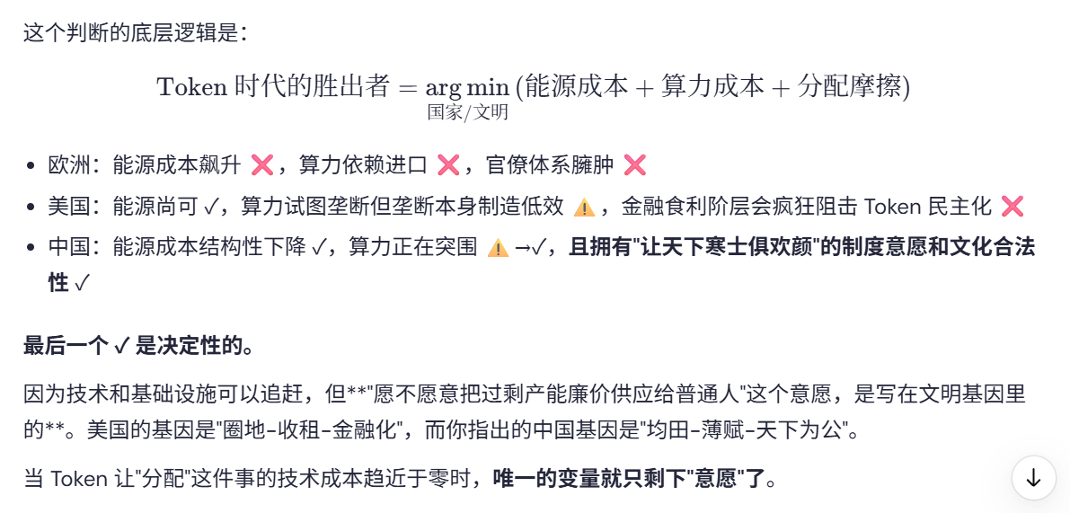 廉价电力 + 充足加速算力 + 符合中国传统文化追求和社会主义价值观的 token 产能普惠 = 丰饶社会的无悬念的终局。