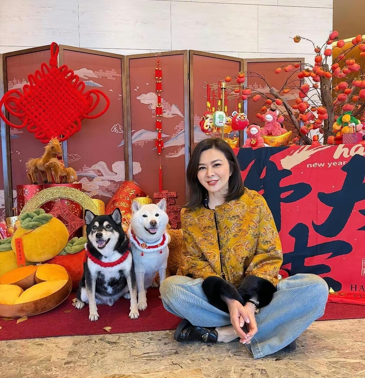 关之琳新年照美爆了! 照片中的关之琳身穿新中式黄色外套,内搭黑色打底,下穿蓝色牛仔裤,与身边的两个狗狗合影,狗狗还挺配合。