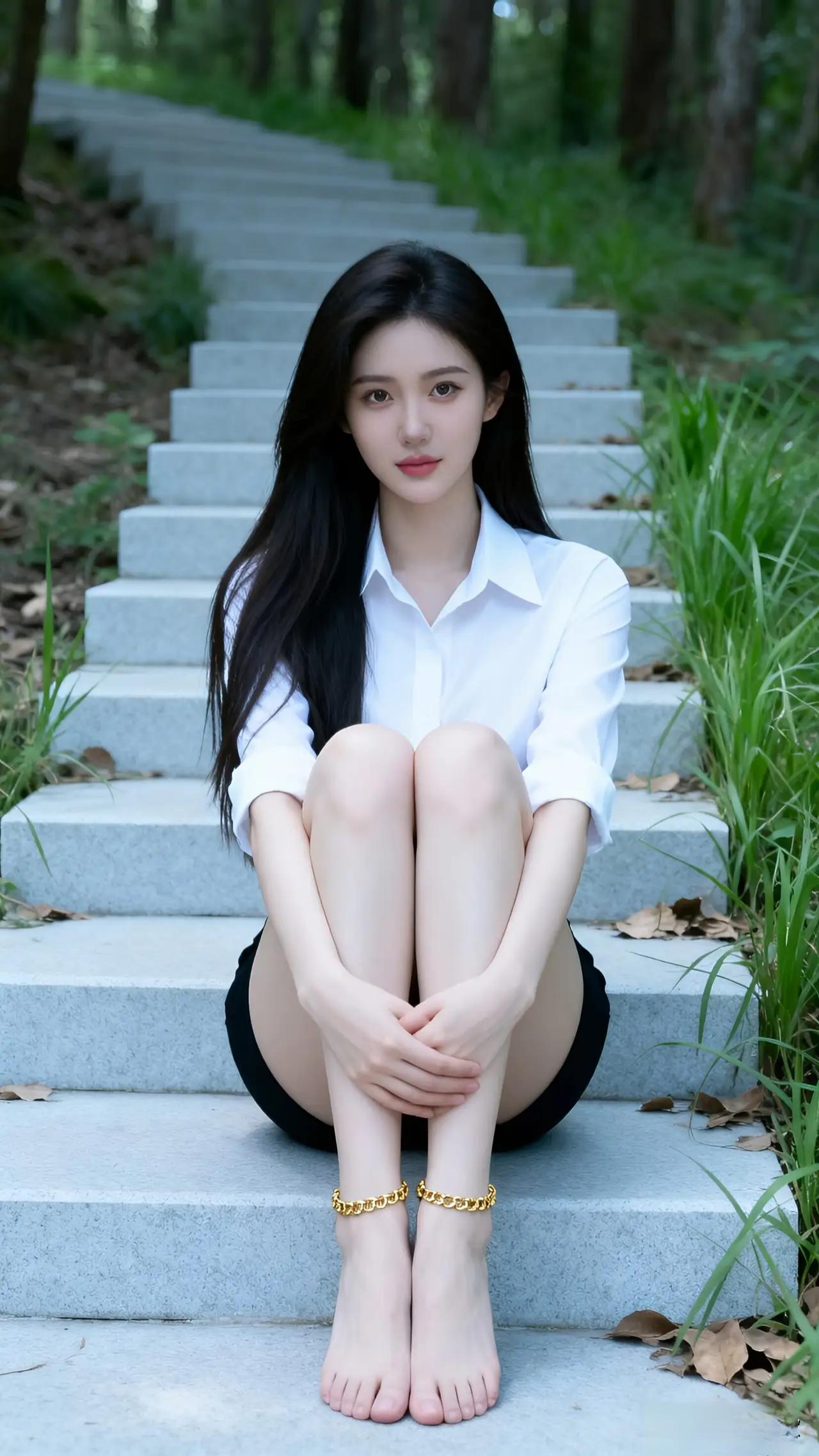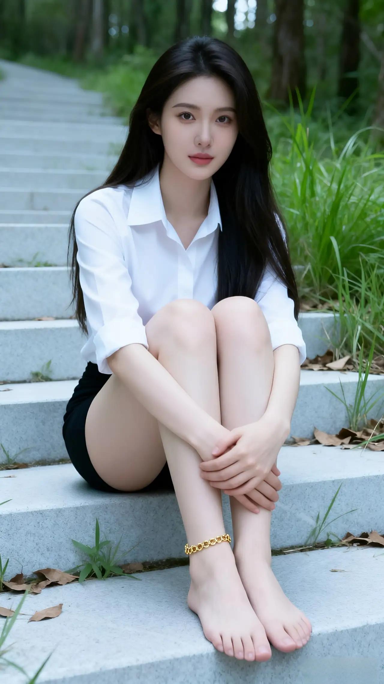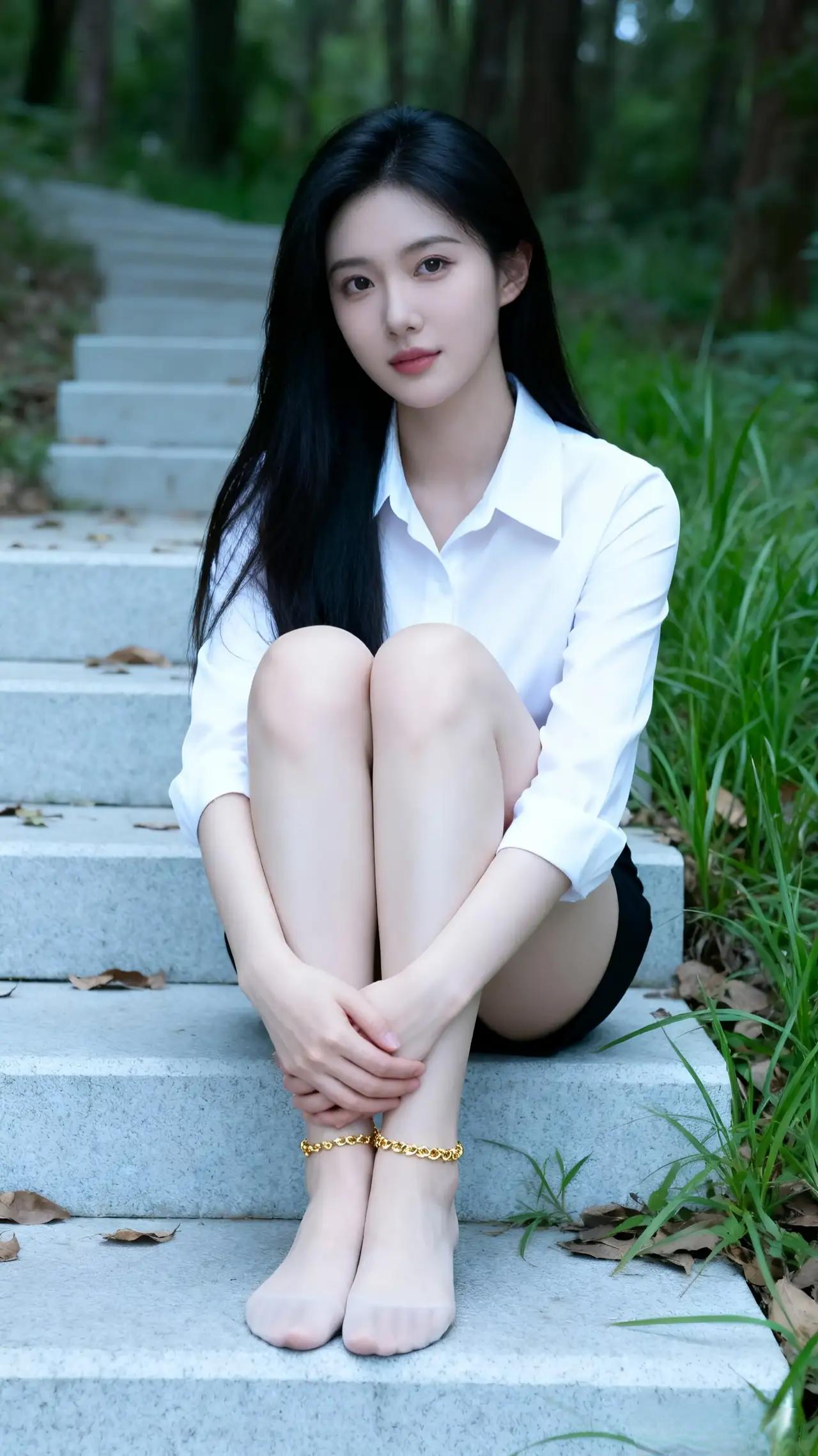 森林中的静谧时光,白衬衫黑短裙,自然光下更显清新。
