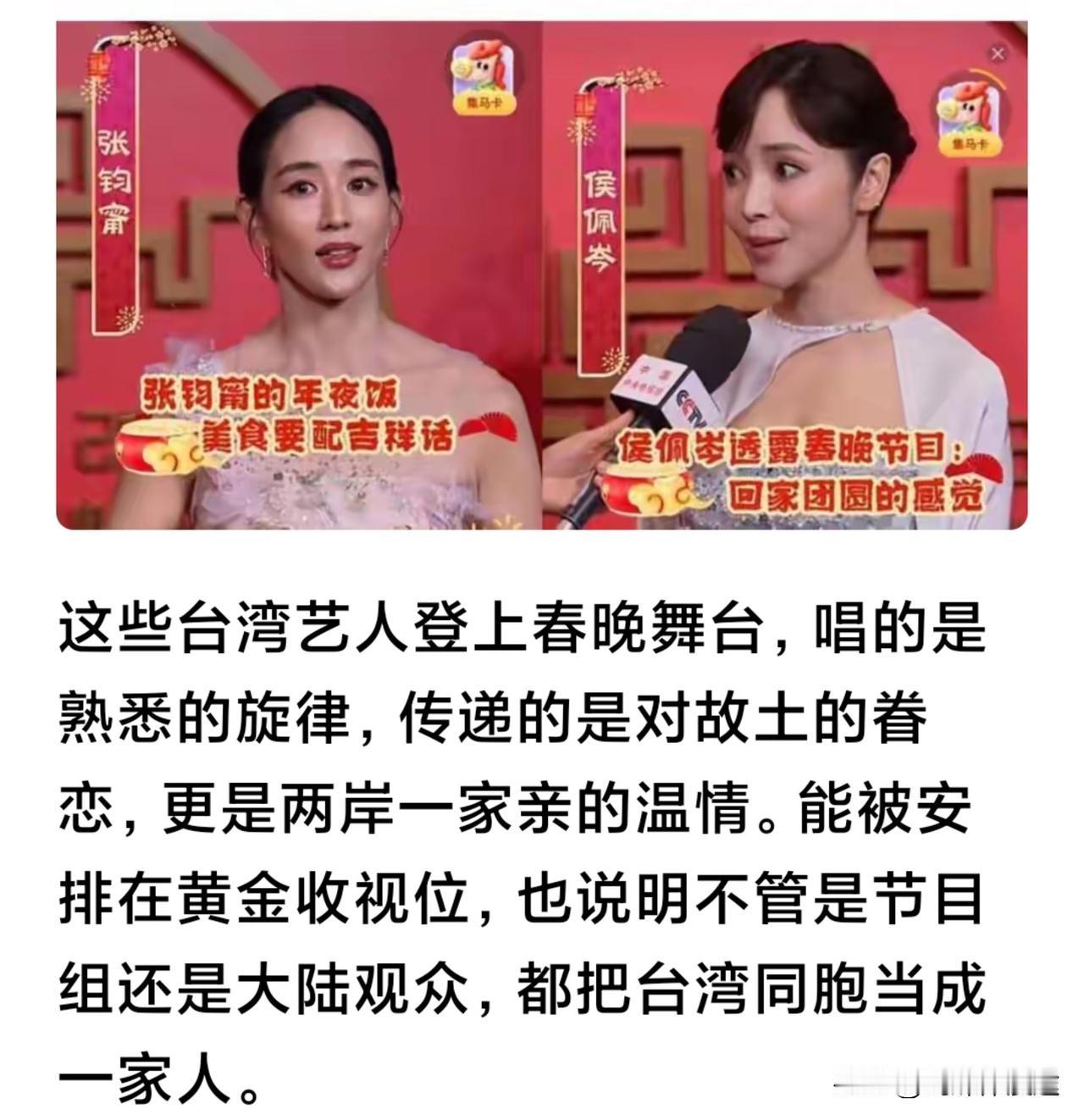 2026 年春晚上“台湾回家”的信号很强烈!马年春晚有 10 位台湾艺人 登上春晚,这也是近年来最多的一次,这种“回家”的信号真的很强烈! 春晚上大陆歌手 周深用一曲《吉量》动感的音乐让中华民族走向大团圆,而最后周深手牵着台湾高山族小朋友碧克.都砮的手,走向了中华民族大团圆!中华民族一个都不能少 中国的土地 一寸都不能少 台湾已经与大陆分开太久太久了,是时候回家了!最后牵着台湾小朋友的手一起回归到中华大家庭来,完成国家的最后统一! 而在 2026 年的整个春晚的节目当中,还有其它 10 位艺人一起登上了春晚舞台,台湾艺人回到大陆 回到春晚的舞台一起共 同欢度过大年 这就是一家人的团圆,所在是十分有意义的事情。 1. 张钧甯:参与演唱歌曲《立春》(第2个节目)。 ​2. 言承旭:参与演唱歌曲《智造未来》(第5个节目)。 3. 胡德夫、辛晓琪、伊能静、周传雄、苏有朋、侯佩岑、欧阳娜娜、陈立农:这8位艺人共同联袂演唱了歌曲《宝岛恋歌》(第22 个节目)。 两岸一家亲 血脉相连 是任何力量都无法阻隔的,台湾是到了该回家的时候的,在春晚的舞台上两岸艺人同台献艺 展现了中华民族多姿多彩的文化,回家吧,不能再推迟了,不能再让等待延续下去,回家,台湾该回家了!