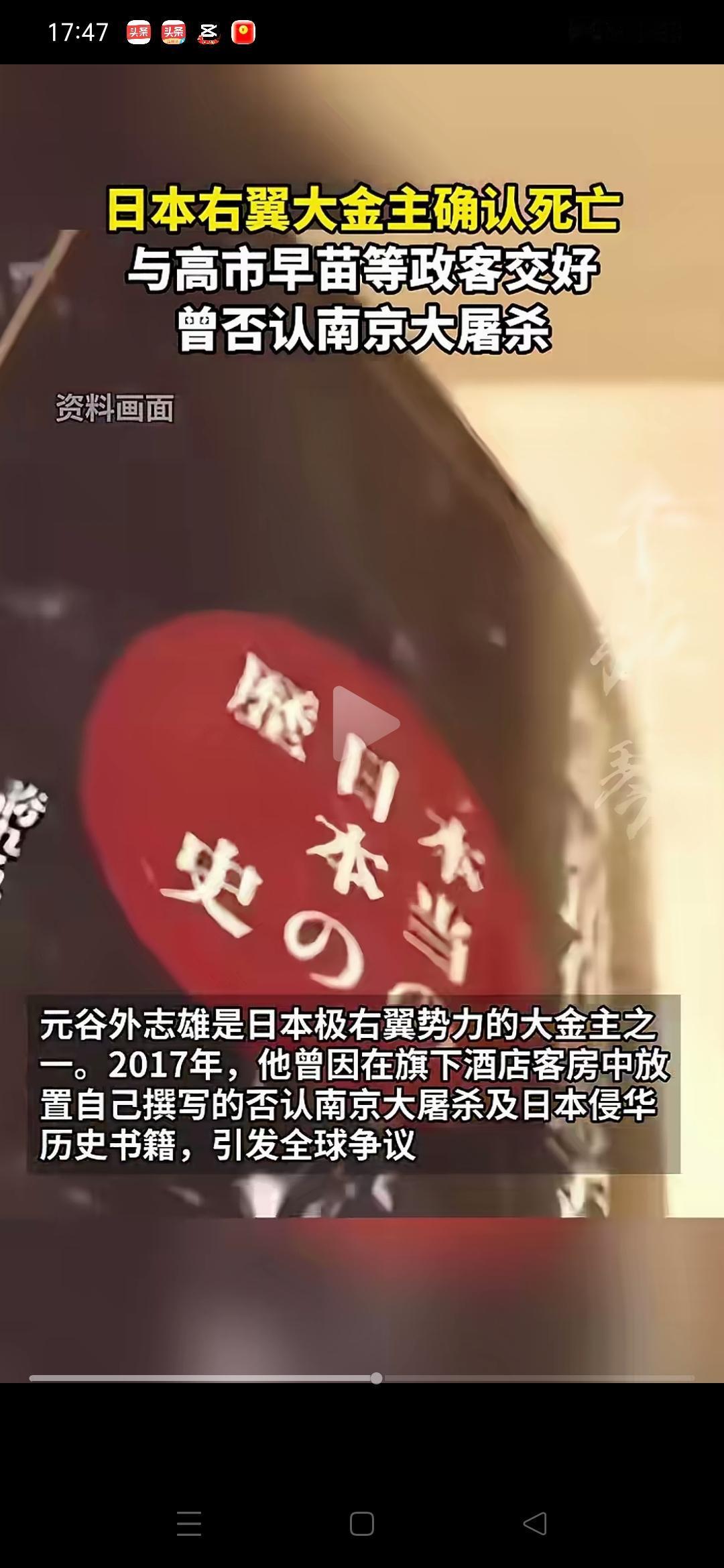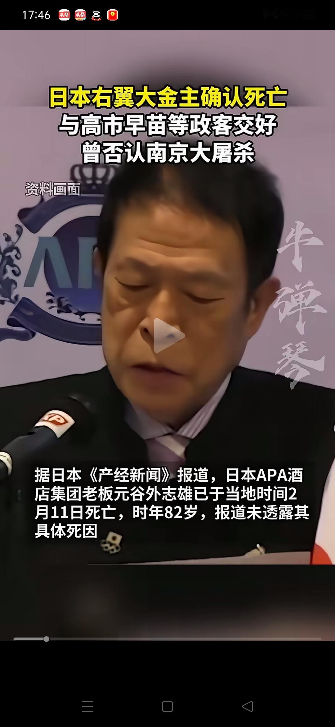 日本右翼金主,作恶多端,死有余辜,下场悲哀! 元谷外志雄是日本大型连锁酒店APA集团的创始人兼首席执行官,是日本极右翼势力的大金主之一。他于近日去世,时年82岁,报道未透露其具体死因。 他一生顽固歪曲历史、否认南京大屠杀,资助右翼,用商业平台散布历史谎言,遭到全世界正义人士唾弃。历史不容篡改,真相不容抹杀,任何挑战人类良知与历史底线的人,终将被钉在耻辱柱上,死有余辜! 日本右翼势力有民间基础,赞助者很多,元谷外志雄就是代表。中华民族被日本惨无人道侵略,日本不思悔改,今天,要警惕历史修正主义死灰复燃。尊重历史,才是对生命与和平最好的守护。 日本极右势力 日本商界访华 美国对欧洲的态度是否会持续下去