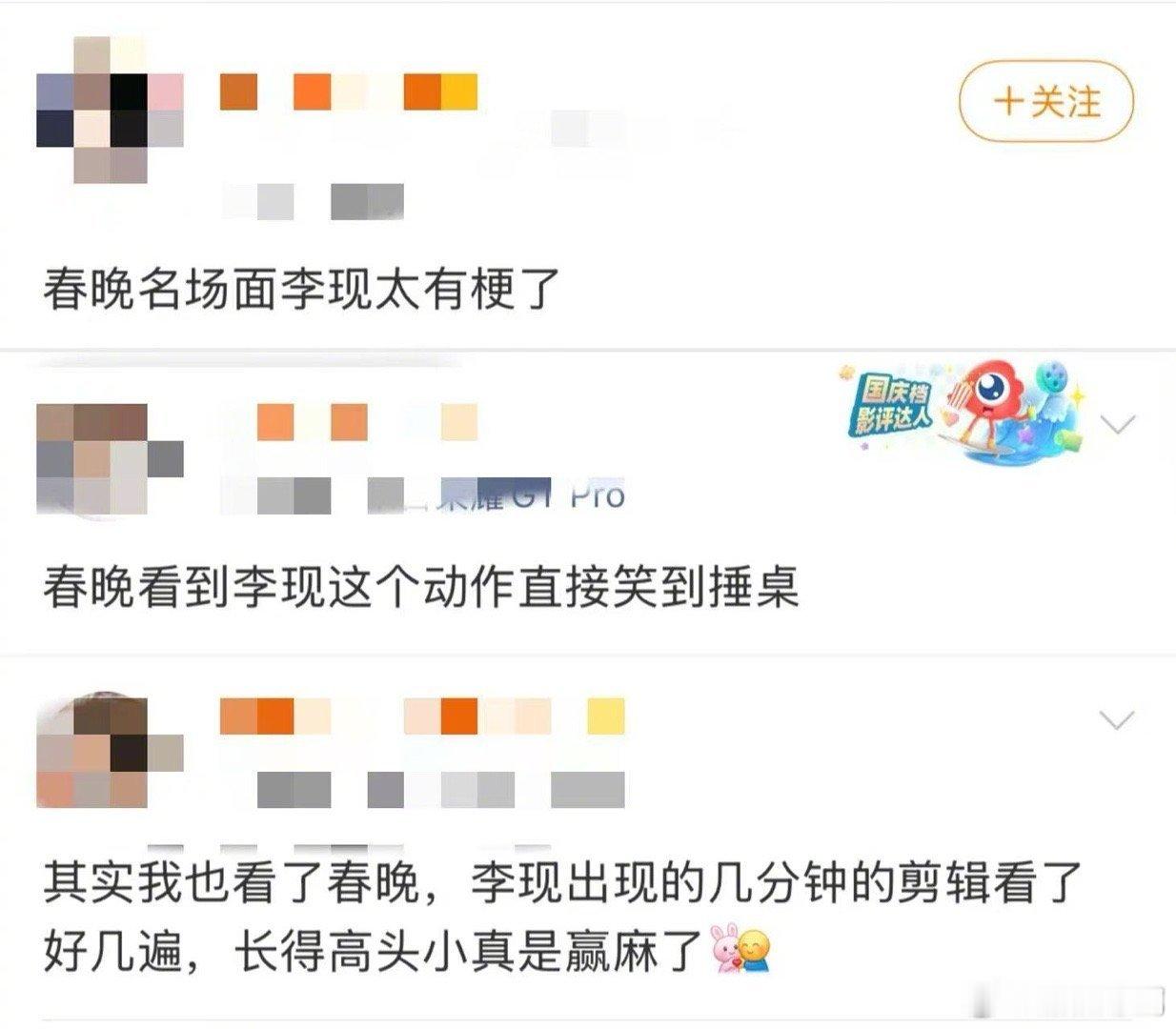 路人对李现的春晚评价 路人都在夸李现的松弛感,说他在微音乐剧里又唱又演,衔接得丝滑自然,“仿佛不是来上春晚,是来演职场剧的” 春晚