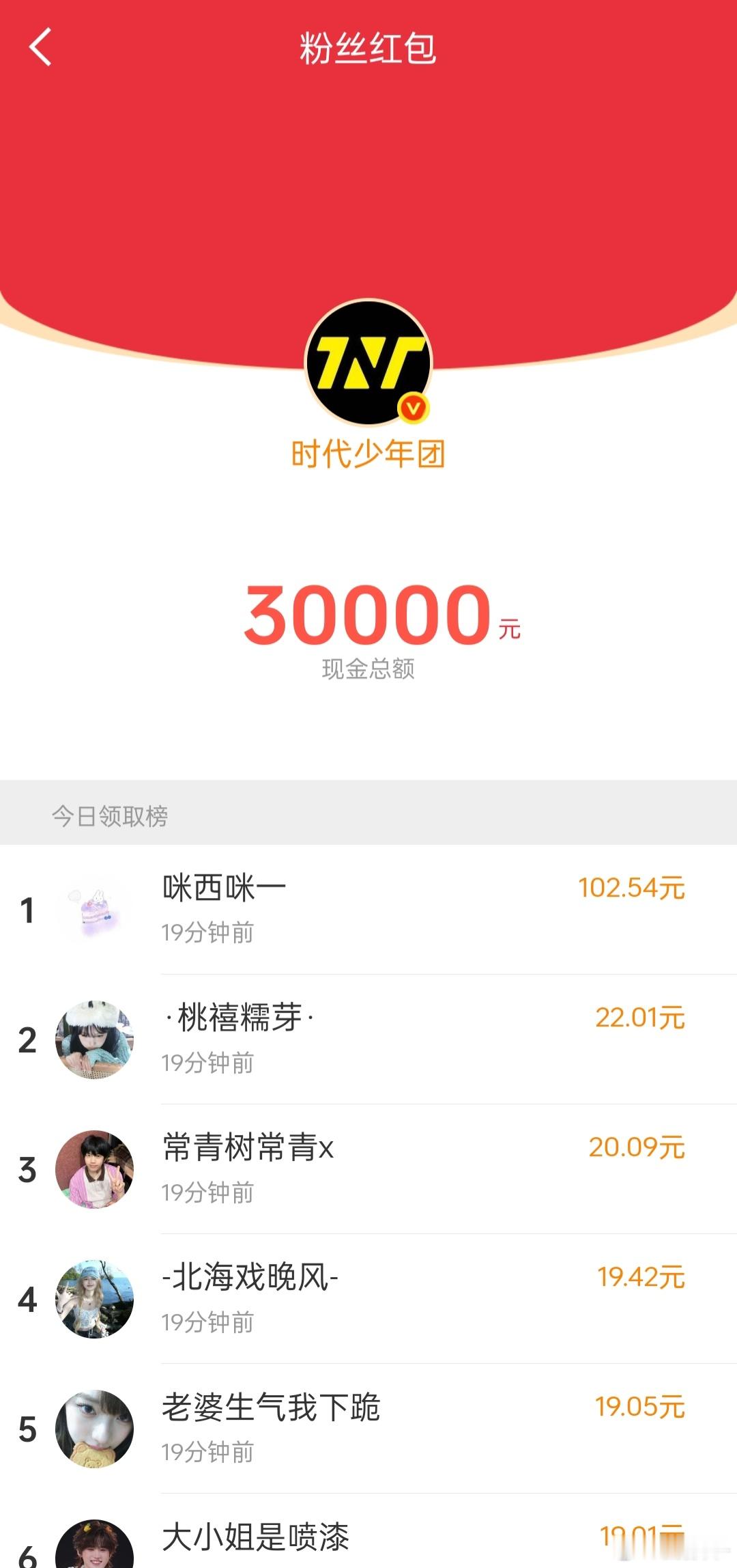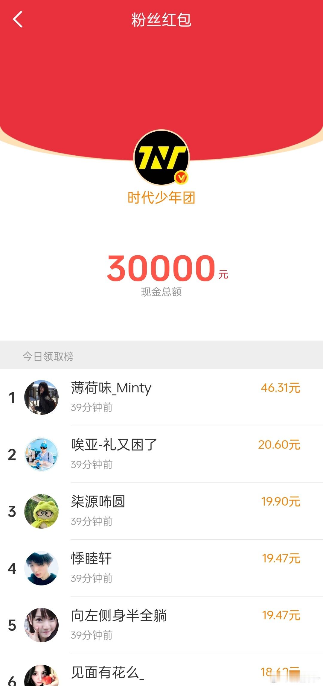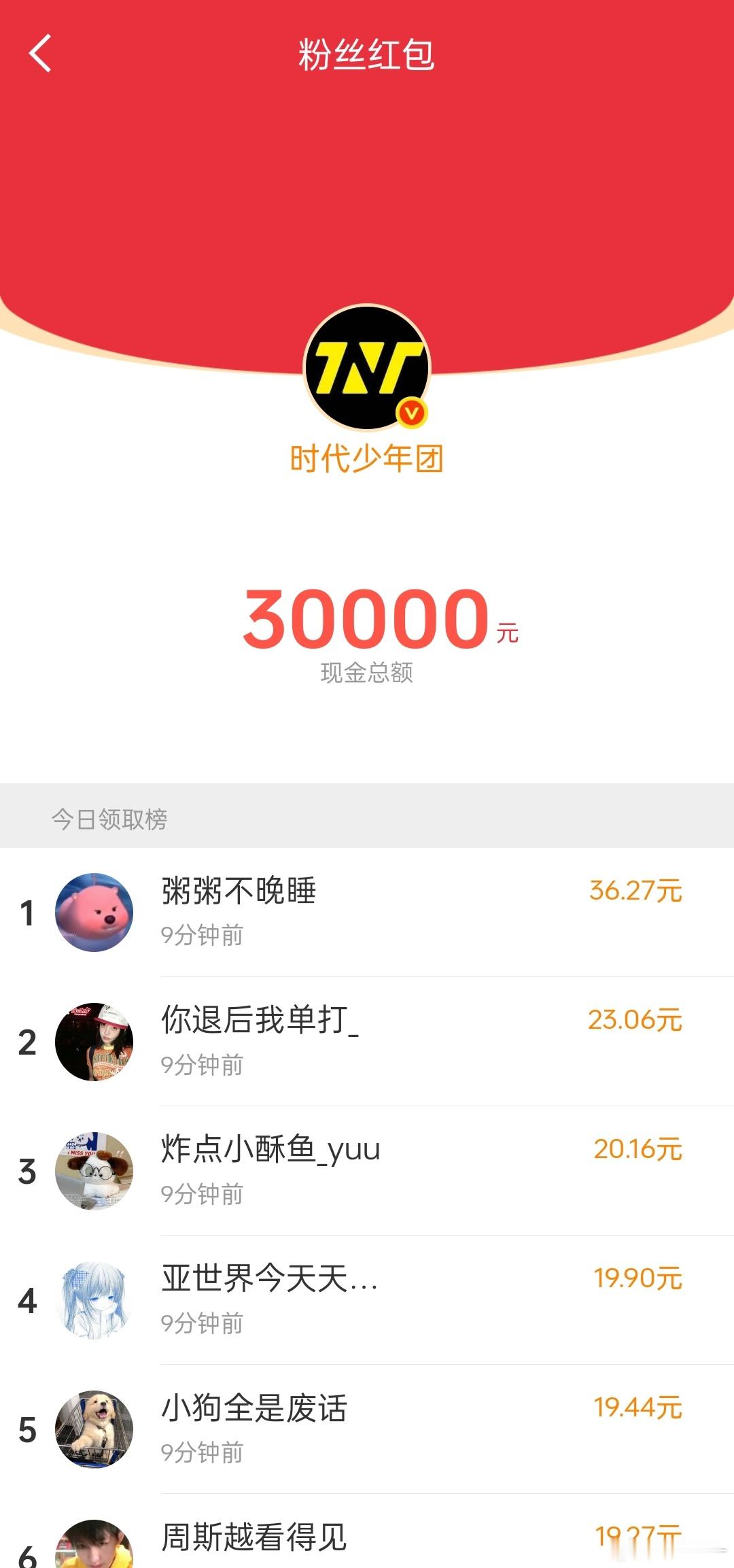 时代少年团红包好大方!!已经发了好几个30000了,有谁抢到啦