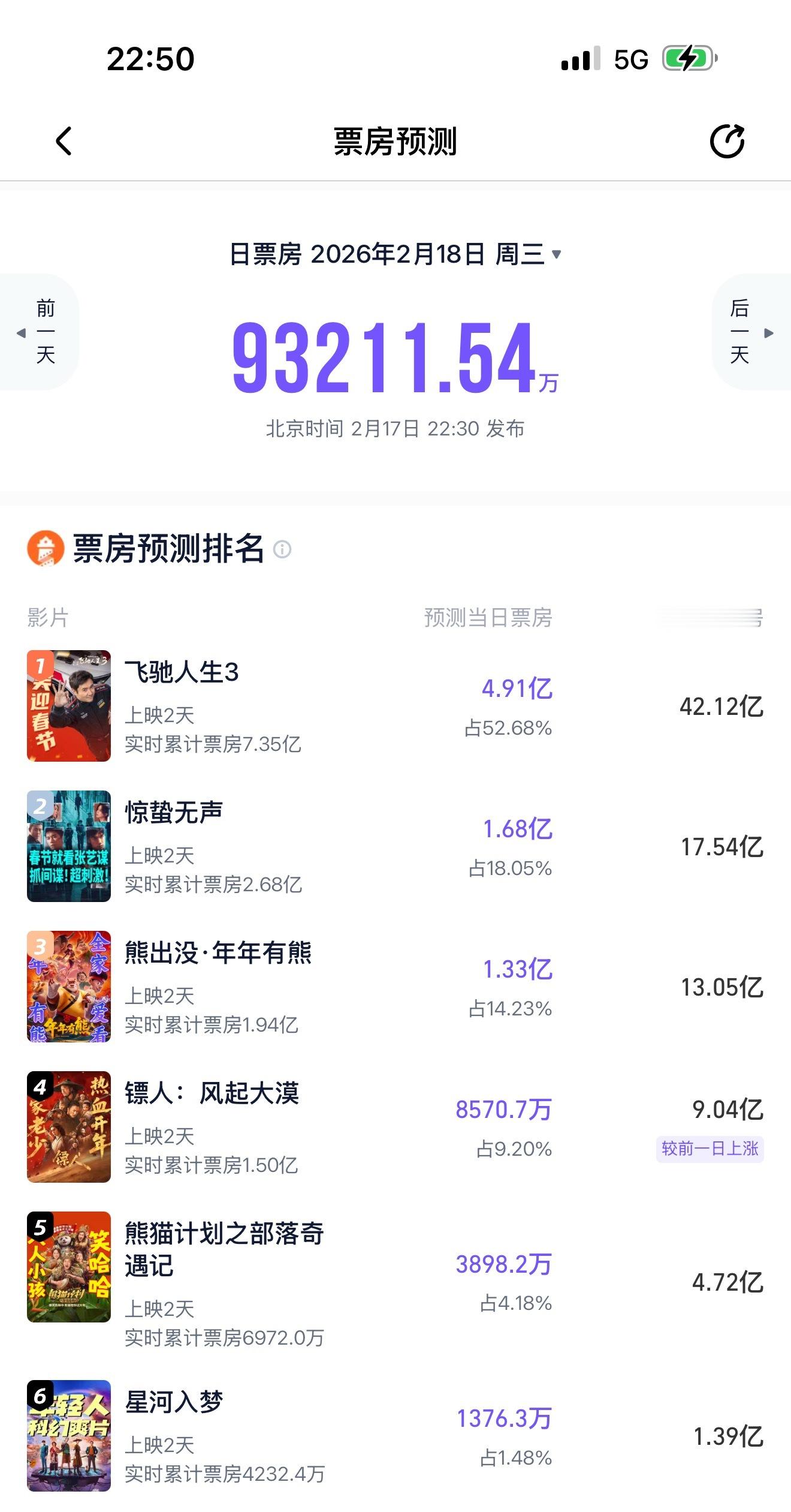 最新票房预测,飞驰人生和熊出没涨了,镖人和熊猫计划基本维持着,星河入梦从2.05亿降到1.3亿,今年电影和电影之间票房之间差距很大,基本没竞争氛围。
