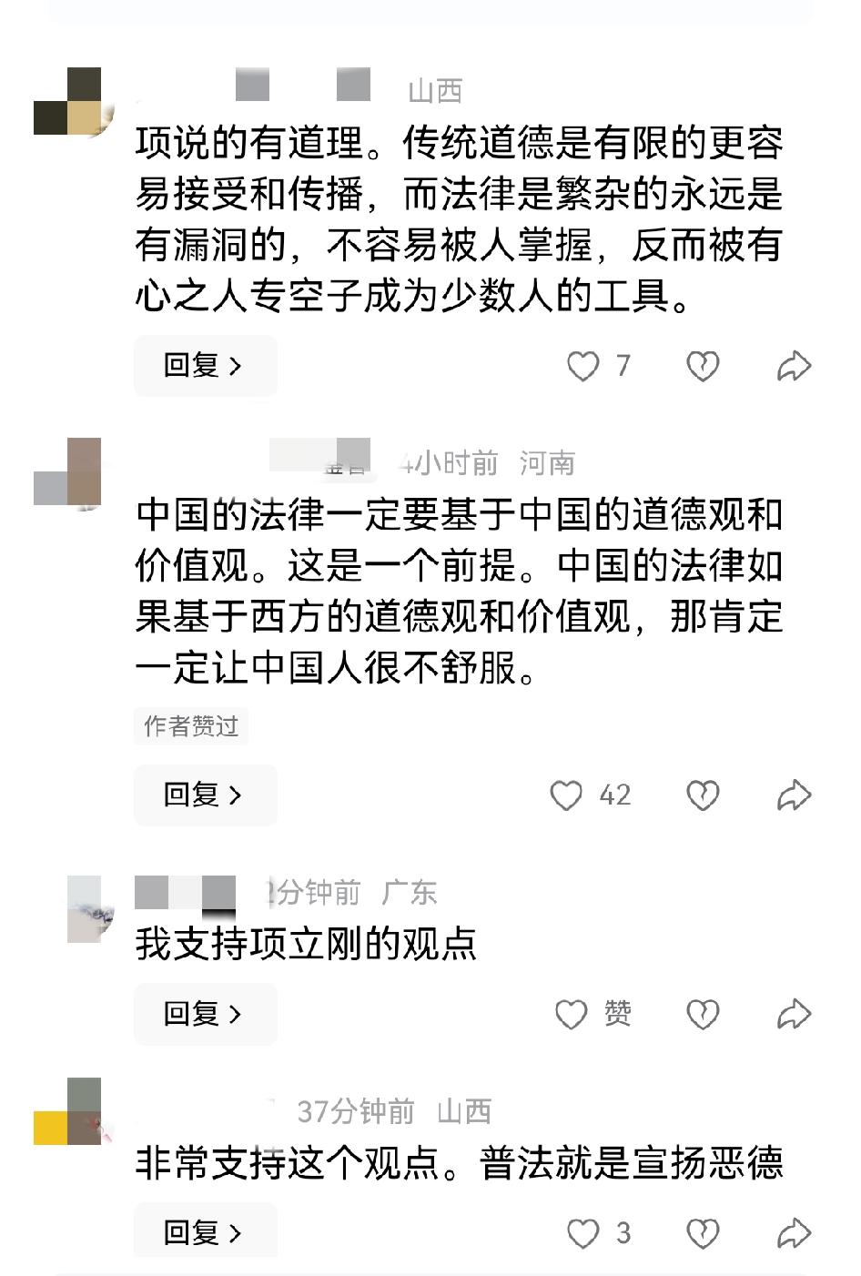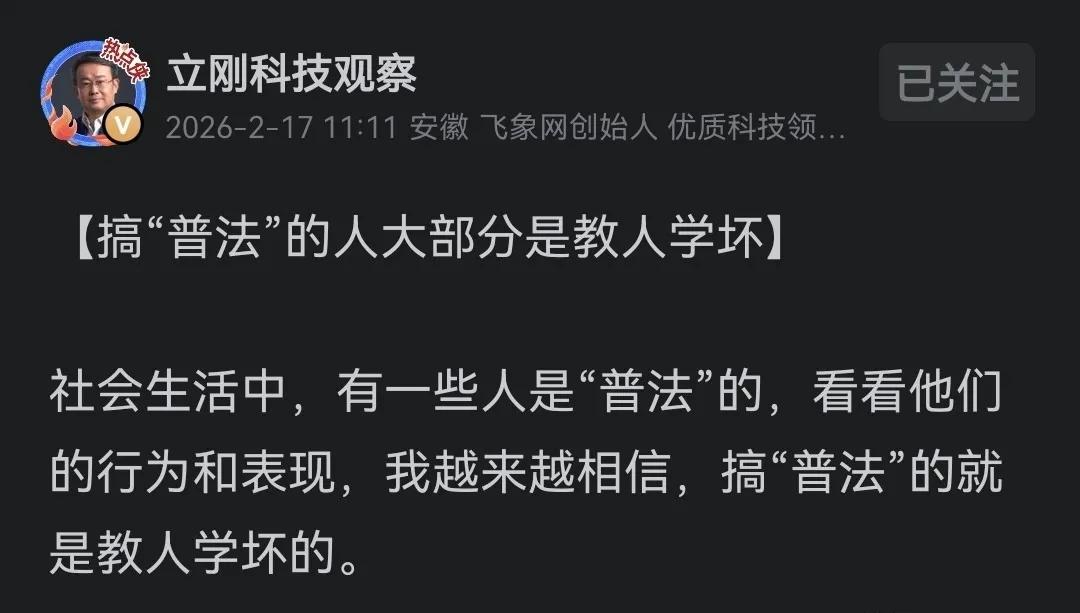 项立刚开炮:搞普法的大部分教人学坏? 2月17日,项立刚发文引发热议。核心观点:懂道德就不会犯法,没必要懂那么多法律。普法普多了,反而教人钻空子。 打老婆不是不懂法,是不懂人伦。他举例子:家暴男缺的不是法律知识,是基本道德。该宣传的不是"不能打老婆会坐牢",是"夫妻要相互尊重"。法条治不了人心。 美国懂法社会?有钱人定的规则。项立刚直指:美国法律精英制定、精英解释,所以精英可以为所欲为。爱泼斯坦案就是活例子——恶事干尽,在你面前晃悠,你却没辙。 钻法律空子,比犯法更可怕。懂法的人干坏事,能精准避开红线。普法普成技术手册,坏人学了更坏。道德是底线,法律只是高线,本末倒置就出事。 网友:中国法律得基于中国道德。法律若基于西方价值观,中国人肯定不舒服。道德观不同,生搬硬套就是水土不服。项立刚这话,说到心坎里了。 道德能替代法律吗?有人反驳:没有法律兜底,道德就是空话。但项立刚的意思或许是——法律该是道德的延伸,不是道德的替代品。两者都重要,但根在德。 项立刚的"普法教人学坏"论,听着激进,实则戳中痛点:当法律变成技术博弈、当懂法成为作恶工具,法治就异化了。他用美国权贵逍遥法外证明——法律再完善,解释权和执行权若在上层手里,就是统治工具。中国要避免这条路,就得让法律扎根于本土道德观,而不是移植西方条文。当然,道德不能替代法律,但法律若失去道德灵魂,就是精致的恶。项立刚的警示值得听:普法之前,先普德;懂法之前,先懂人。 对此你怎么看?