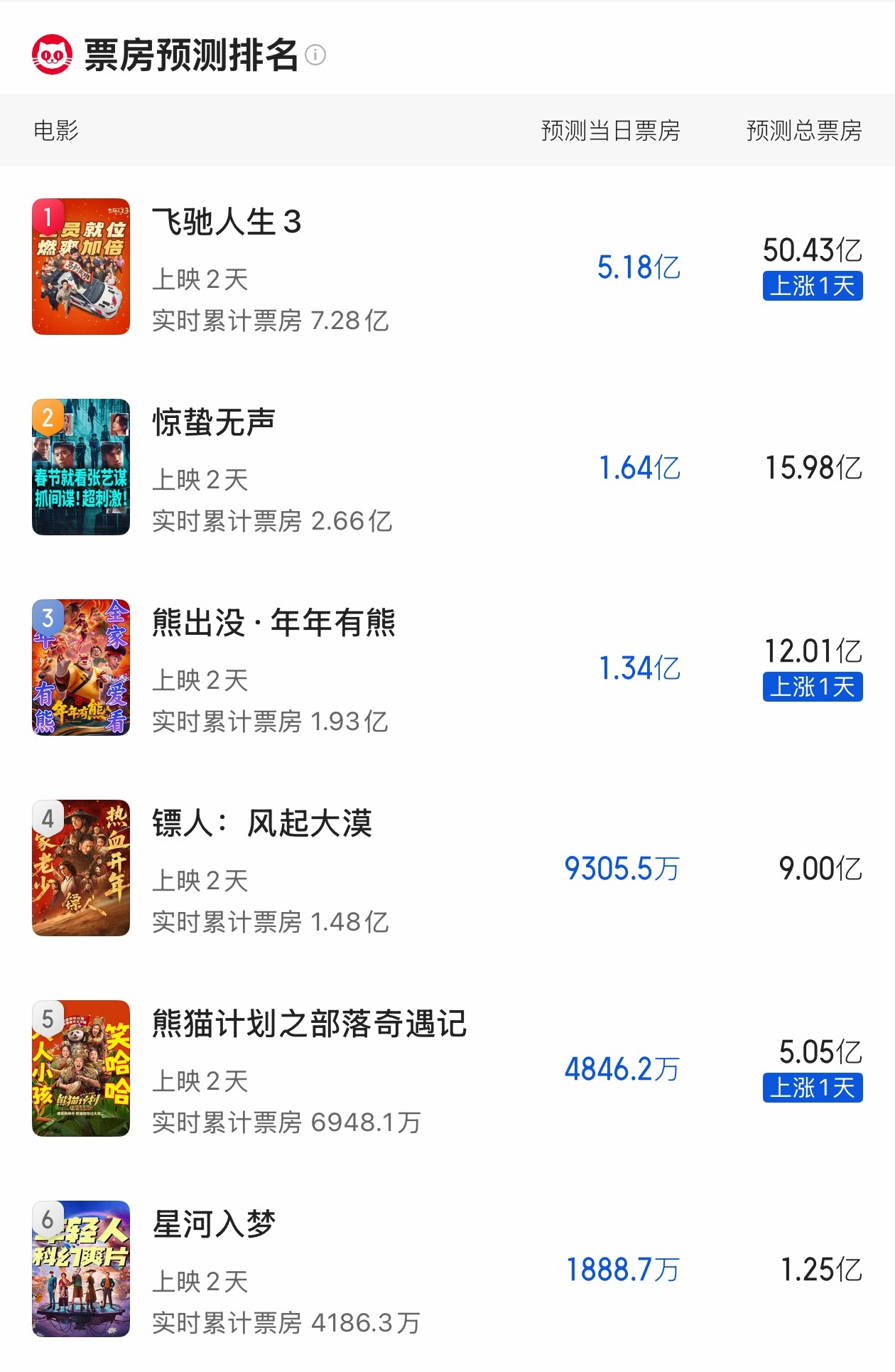 猫眼最新票房预测来了,飞驰人生3票房来到了50亿+。