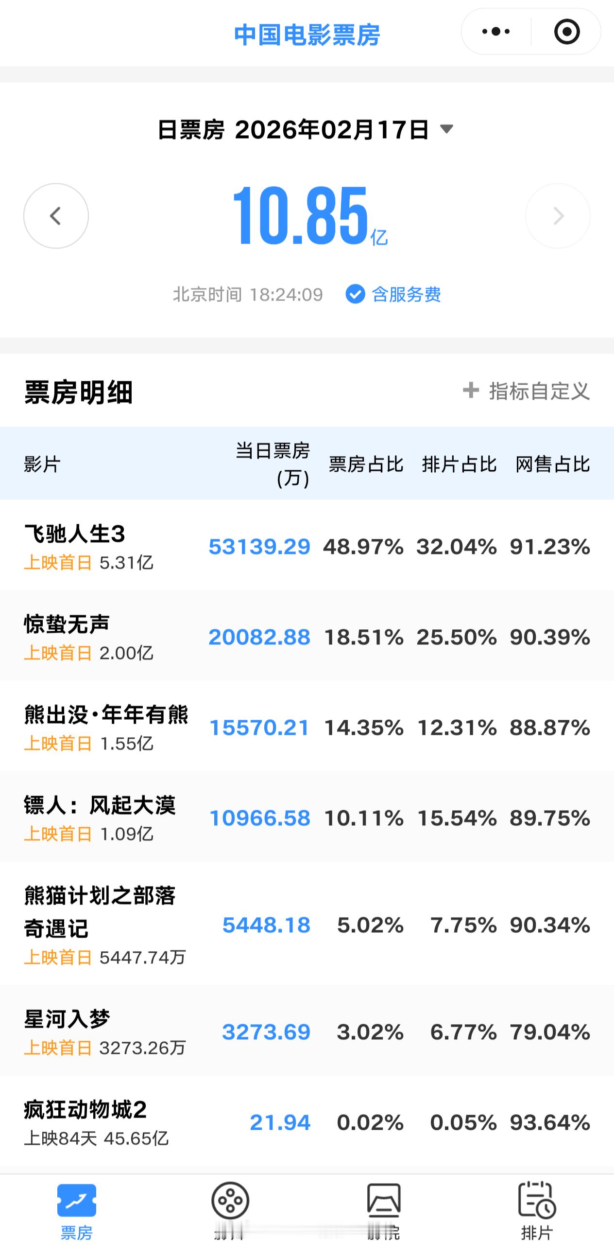 春节档影片现在看是《飞驰人生3》遥遥领先……且票房占比大幅高于排片占比,且从社交网络来看没有出现大规模的口碑问题,预估明天起不少影院将会加大它的排片占比……