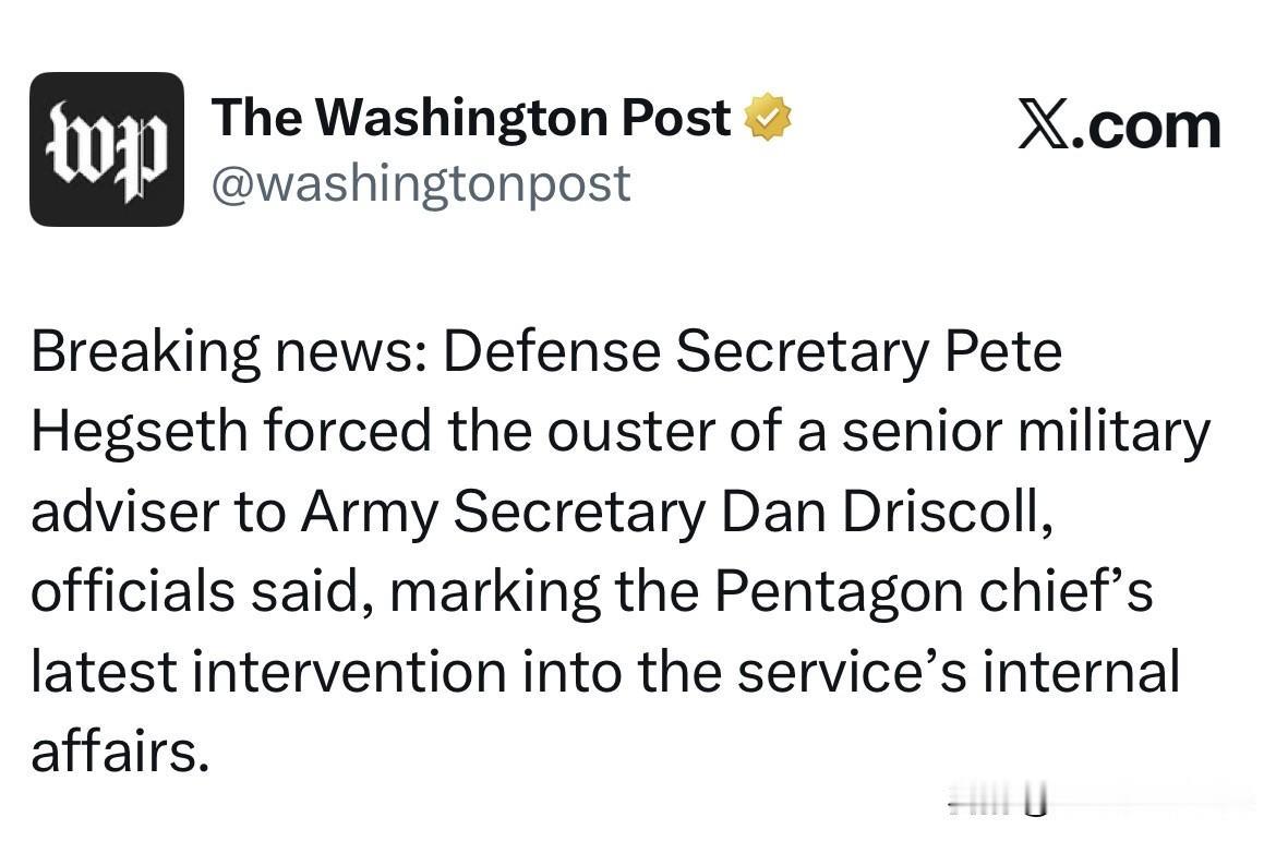 《华盛顿邮报》透露突发新闻:内部相关官员们表示,国防部长皮特·赫格塞斯(Pete Hegseth)迫使陆军部长丹·德里斯科尔(Dan Driscoll)的一名高级军事顾问离职,这标志着五角大楼负责人对国防部(战争部)内部事务的最新干涉。