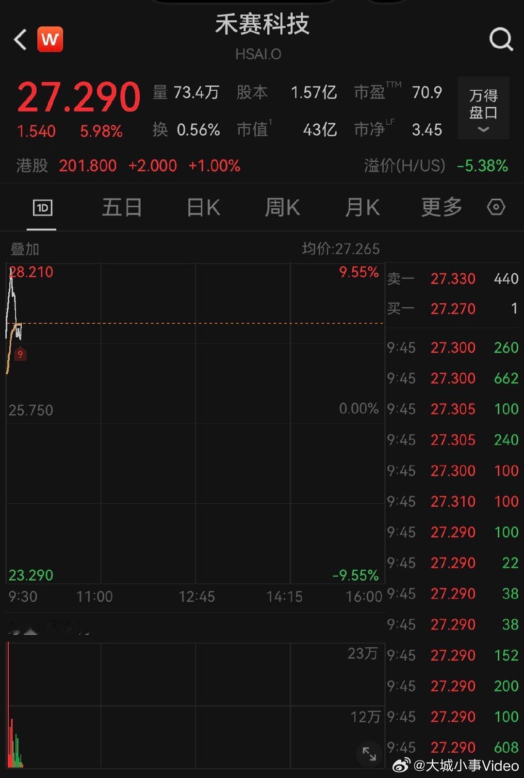【禾赛美股盘初涨超7%】禾赛美股大涨 2月17日,禾赛美股盘初涨超7%,马年春晚宇树两款人形机器人全部搭载了禾赛JT128激光雷达。(财联社)