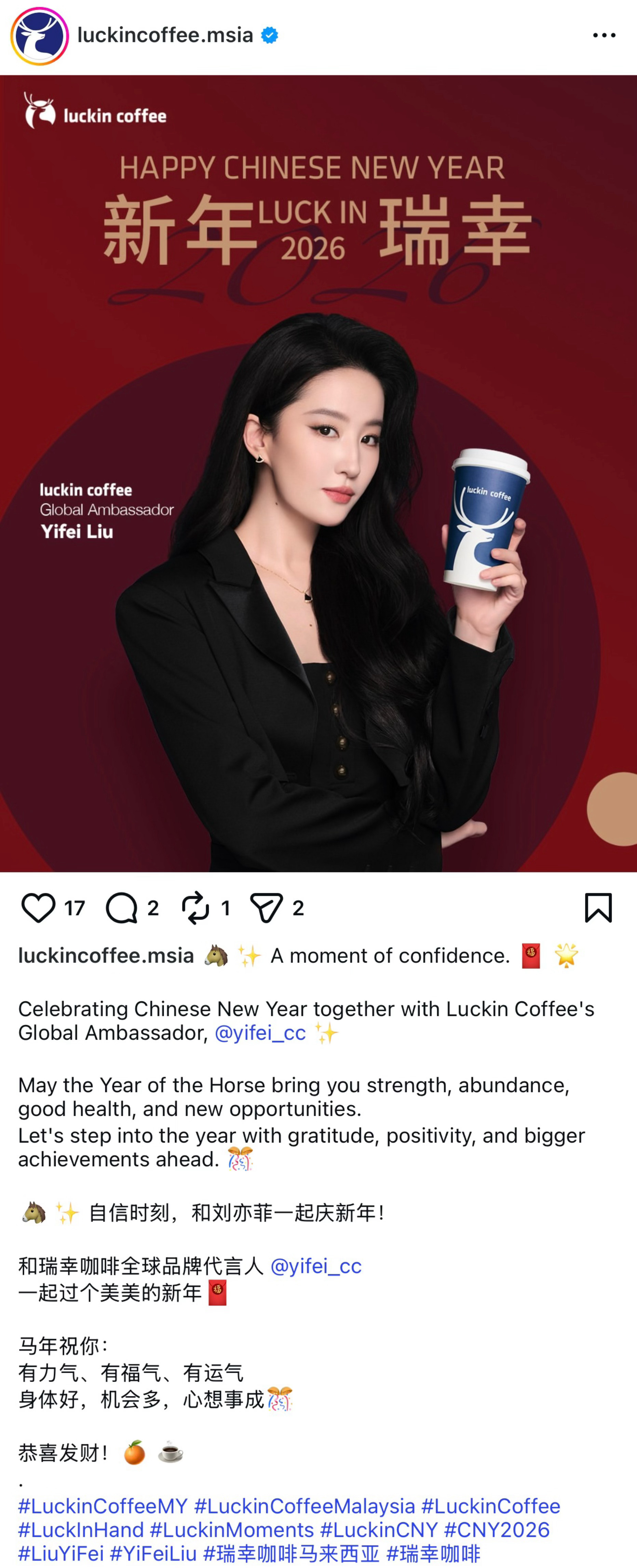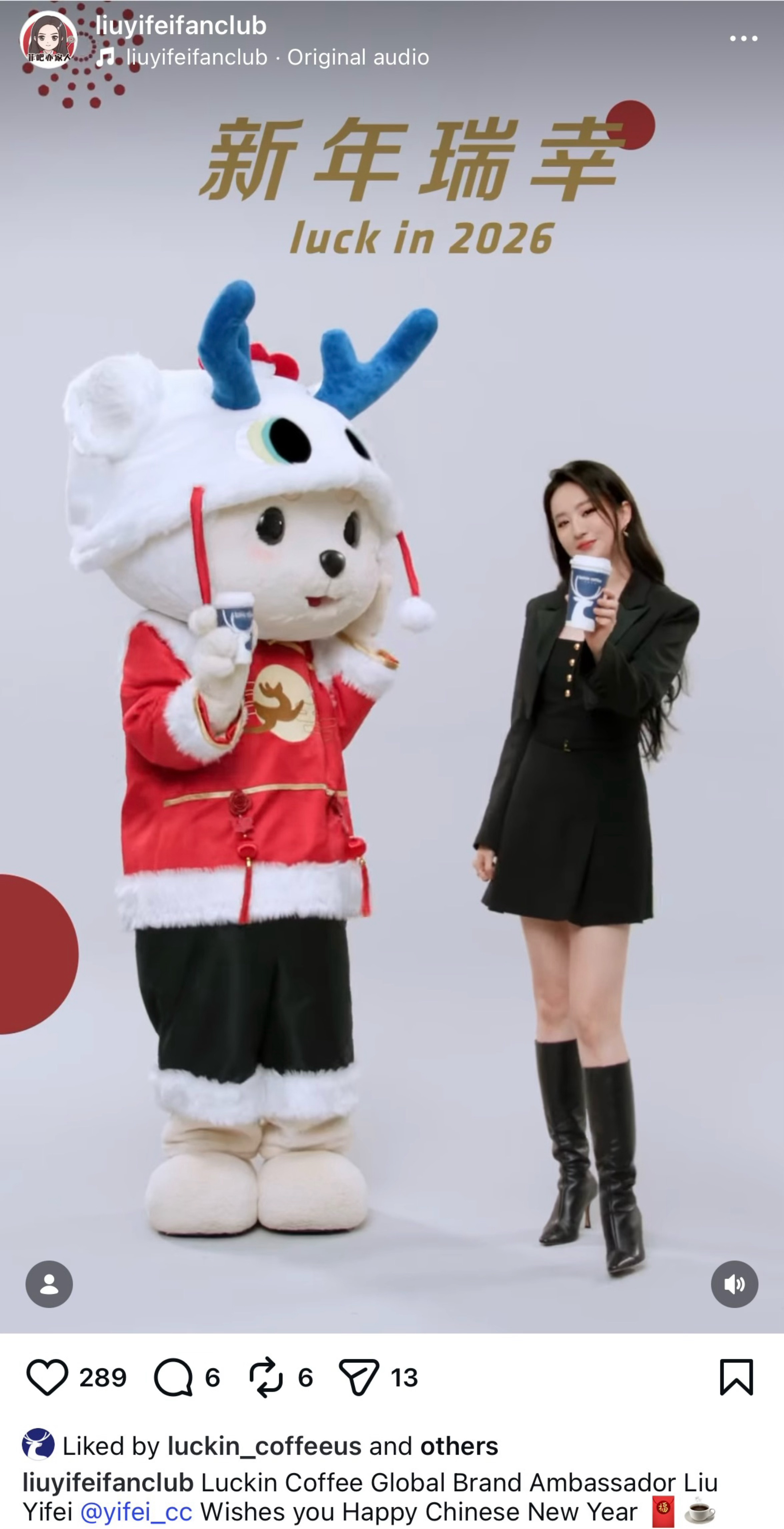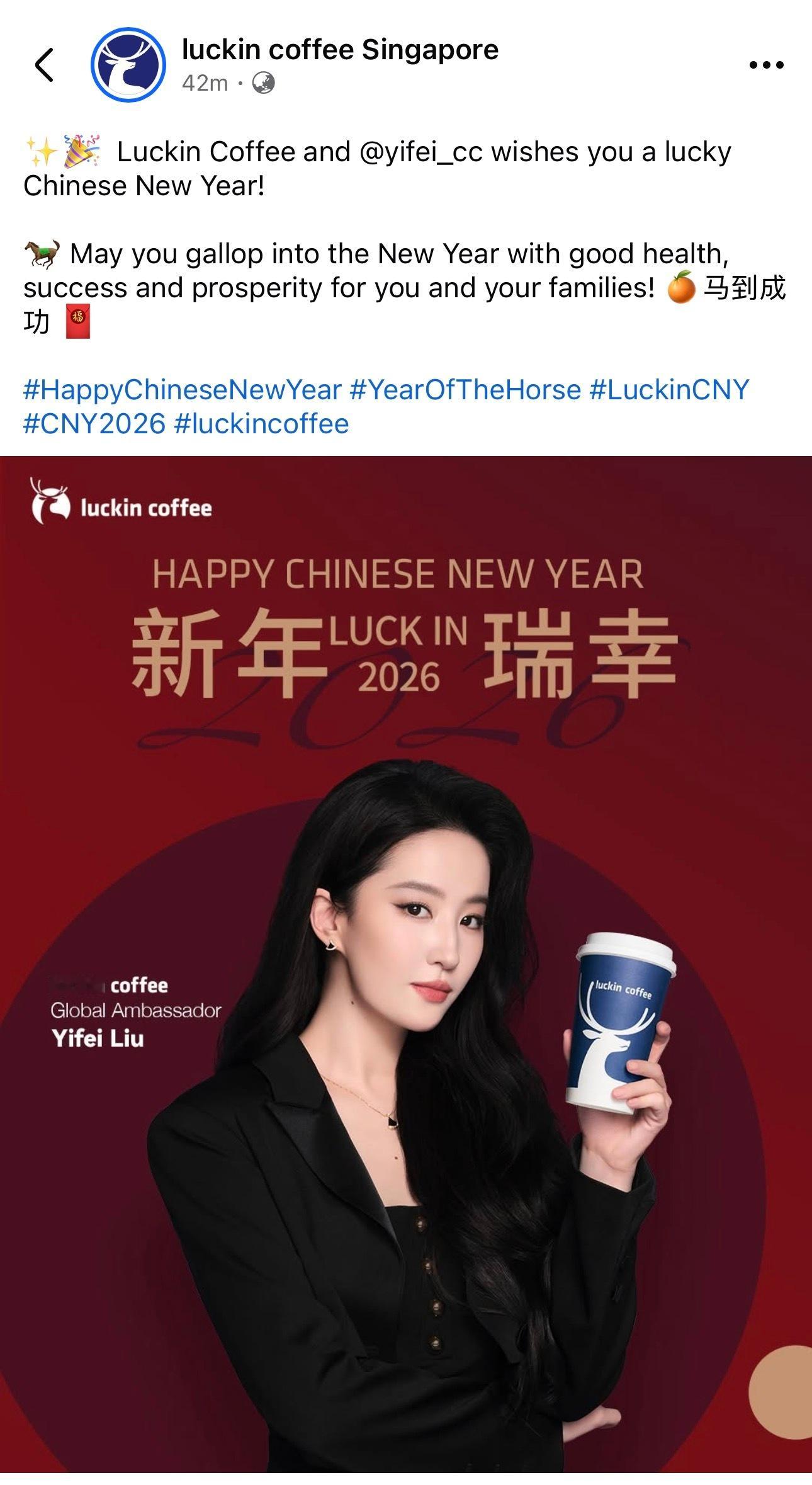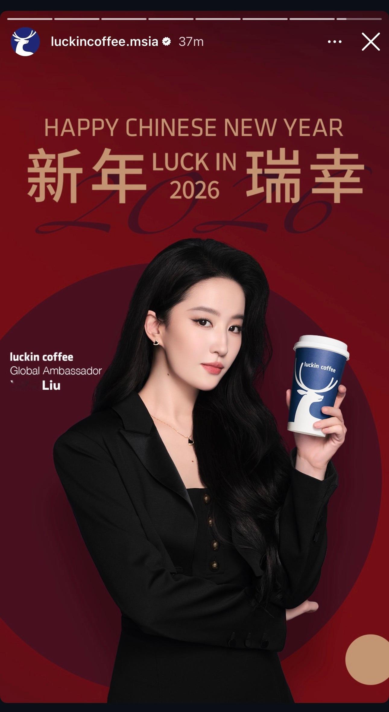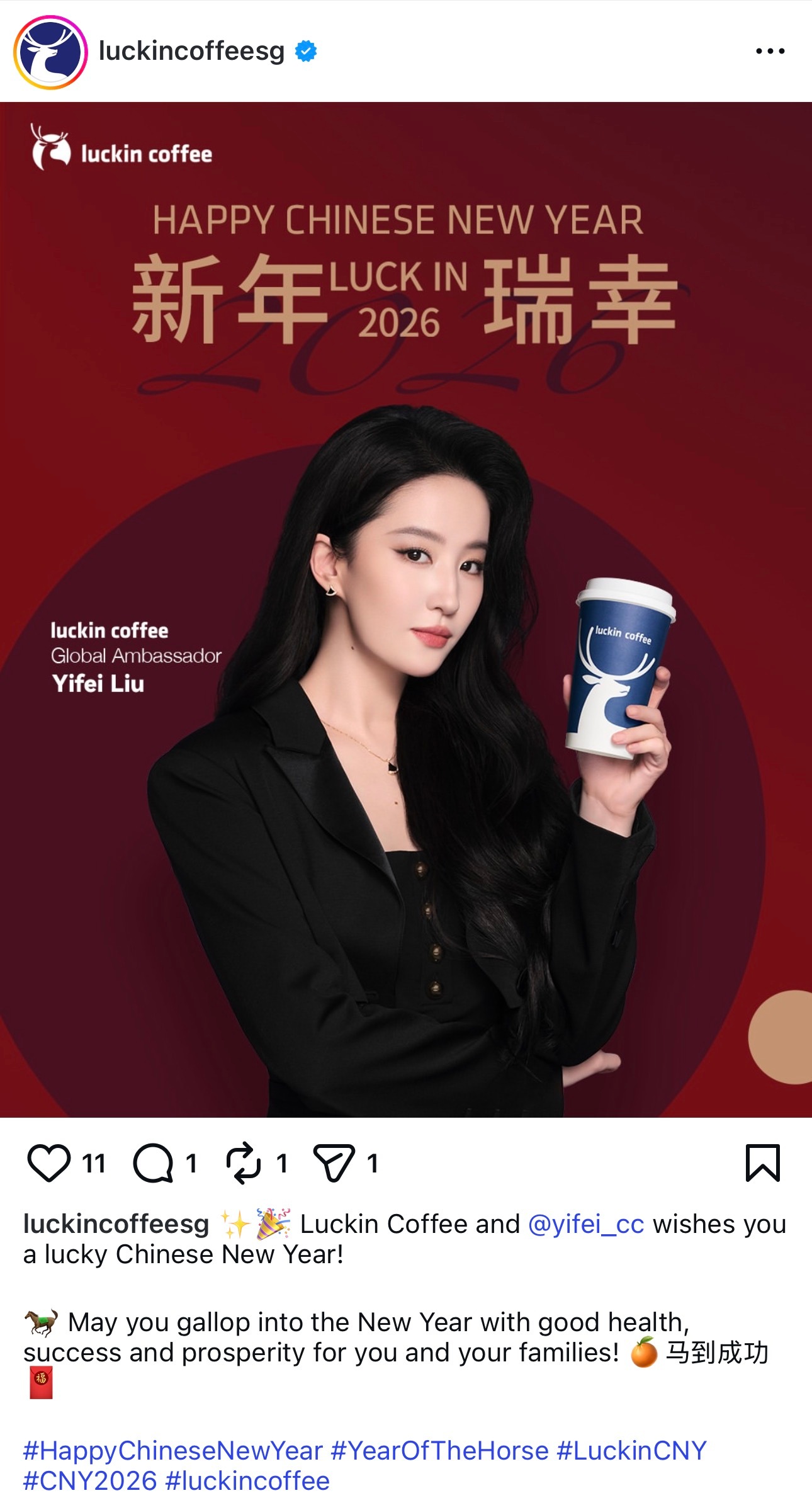 刘亦菲 瑞幸咖啡海外平台Luckin Coffee Singapore、Luckin Coffee Malaysia、Luckin Coffee US在官方Ins、FB发布和点赞全球品牌代言人刘亦菲新春祝福🧧一年一起瑞起来 刘亦菲瑞幸咖啡全球品牌代言人