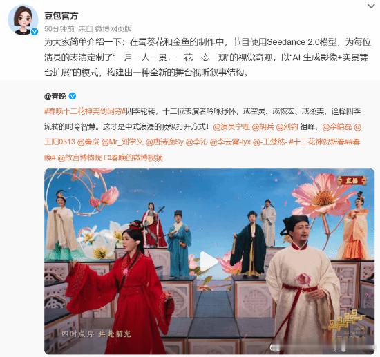 春晚《贺花神》火了2026年央视春晚的创意秀《贺花神》确实使用了豆包Seedance 2.0技术,成为全球首个深度应用该AI视频生成模型的公开项目。豆包官方发文揭秘:为大家简单介绍一下,在蜀葵花和金鱼的制作中,节目使用Seedance 2.0模型,为每位演员的表演定制了“一月一人一景,一花一态一观”的视觉奇观,以“AI 生成影像+实景舞台扩展”的模式,构建出一种全新的舞台视听叙事结构。
