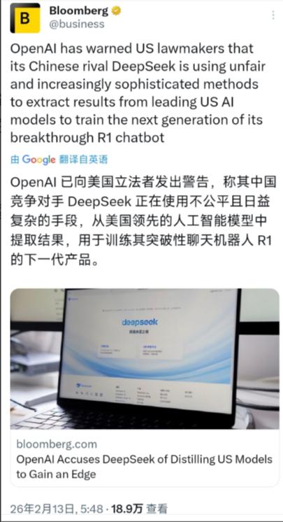 彭博社消息:OpenAI 已向美国立法者发出警告,称其中国竞争对手 DeepSeek 正在使用不公平且日益复杂的手段,从美国领先的人工智能模型中提取结果,用于训练其突破性聊天机器人 R1 的下一代产品。 这封发给美国众议院中国特设委员会的秘密备忘录,标志着中美 AI 竞争进入了一个极具讽刺意味的新阶段。 先把话说明白,OpenAI 这波操作不是公开喊话,是偷偷递小报告。它没敢直接跟 DeepSeek 对线,反倒找美国立法者告状,核心就是说 DeepSeek 靠“歪路子”偷它的模型结果,用来升级自家 R1 聊天机器人的下一代产品。 但有意思的是,OpenAI 自始至终没拿出任何实质性证据,全是口头指控。它嘴里说的“不公平且复杂的手段”,业内人一看就懂,大概率指的是模型蒸馏技术,可这项技术本身就是AI领域的常规操作,根本算不上什么“偷”。 CNN 早就刊文吐槽过 OpenAI 的虚伪。OpenAI 自身就是靠未经许可抓取全网数据起家的,现在反倒指责另一家公司用常规技术开展研发,这种双重标准简直离谱。 DeepSeek 可不是什么无名小卒,它是幻方量化旗下的大模型公司,自家的 R1 系列模型实力过硬。 2025年初 DeepSeek 正式发布 R1 模型,还同步开源了模型权重,没多久就在 Arena 基准测试里冲到全类别第三,甚至在风格控制类和 OpenAI 的 o1 并列第一。 更能说明问题的是,英伟达、微软、亚马逊这三家美国头部企业,都主动接入了 DeepSeek-R1 模型。要是 DeepSeek 真的靠偷技术立足,这些美国巨头不可能傻到主动合作。 OpenAI 之所以急着告状,本质就是竞争压力太大。它自己也承认,美国目前在AI领域的领先优势已经不大,还在不断缩小。DeepSeek 能用美国同类模型几分之一的成本,达到相近的性能,这种效率优势直接戳中了 OpenAI 的痛点。 而且中美AI的发展路径本就不同。美国AI企业大多走闭源路线,靠巨额资本堆算力、拼参数,一门心思追求通用人工智能的终极目标,却迟迟难以落地到实际产业中。相关数据显示,中国制造业的AI采用率高达67%,美国仅为34%,差距十分明显。 中国AI企业则走得更务实,DeepSeek 就是典型代表。它不搞“暴力堆算力”,反倒在算法上不断创新,还选择开源模式,让全球开发者都能免费下载使用,这种模式也让它快速积累了大量用户和生态资源。 Meta 首席科学家杨立昆也直言,硅谷一些人有种错位的优越感,总觉得圈子外的创新都是靠“作弊”得来的。他明确表示,DeepSeek 的突破是开源力量的体现,人家是在现有基础上做了新创新,根本不是什么“偷技术”。 再看这封秘密备忘录的接收方——美国众议院中国特设委员会,这个委员会本身就长期戴着有色眼镜看待中国科技发展,之前就提交过关于中国AI“剽窃”美国技术的不实指控,还建议国会出台更严苛的涉华法案。 OpenAI 选这个时间点递小报告,说白了就是想借美国政府的手,打压 DeepSeek 这个强劲对手,维护自己的垄断地位。这种靠政治力量干预商业竞争的做法,本身就违背了科技发展的公平原则。 我国外交部之前就明确回应过,美方总爱泛化国家安全概念,把经贸科技问题政治化,恶意打压中国企业,这种行为严重破坏市场规则,也损害了全球产供链的稳定。 人工智能本就是人类的共同财富,不该成为少数国家谋求霸权的工具。OpenAI 与其花时间偷偷告状、抹黑对手,不如沉下心来搞研发,用真正的技术优势赢得竞争。 这波事件最讽刺的地方就在这:一个靠抓取全网数据起家的公司,指责另一家用常规技术创新的公司“不公平竞争”;一个号称引领AI发展的企业,转头就靠政治手段打压对手。 中美AI竞争的下半场,拼的从来不是谁会告状、谁能靠政治力量打压对手,而是谁能真正把技术落地,谁能让AI服务于产业、造福于人。 DeepSeek 的崛起已经证明,中国AI走的务实路线是对的,而 OpenAI 的这波操作,只会让它在全球AI领域的口碑越来越差。