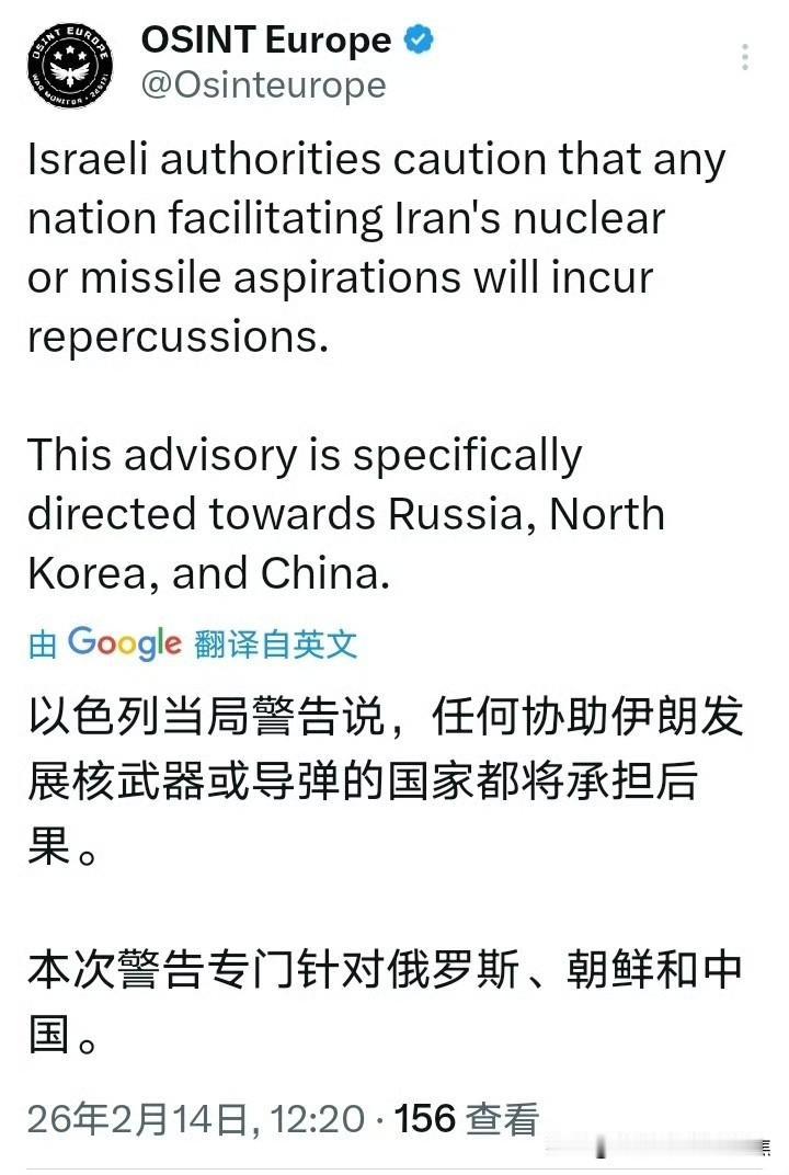 以色列急眼了“发飙”,点名警告中国,称任何协助伊朗发展核武器或导弹的国家都要承担后果。此次警告特意针对俄罗斯、朝鲜和中国。 以色列“三重算计”:压中国、逼美国、吓伊朗 面对以色列的“碰瓷式外交”,中国回应:不吃这一套 以色列此次点名警告中国,实则是在打一场“极限施压”的心理战。其真正目的,是妄图借中国之手切断伊朗的“技术命脉”,同时逼迫美国在谈判桌上对伊朗采取更严厉举措。 一、以色列缘何“发飙”? 以色列此次罕见地对中国放狠话,核心原因只有一个:它真的害怕了。 导弹阴影:去年6月的“十二日战争”中,伊朗的导弹雨差点让以色列引以为傲的“铁穹”系统崩溃。尽管最后停火,但以色列意识到,若伊朗导弹技术进一步升级,自己恐难承受下一轮打击。 技术焦虑:以色列情报显示,伊朗正全力修复导弹生产线,并试图从外部(包括中国)获取制导技术、推进剂等关键部件。以色列担忧,若中国提供军民两用技术支持,伊朗的导弹库存将迅速恢复到战前水平(约2000枚),这对其而言是“生死存亡”的威胁。 二、警告背后的“三重算计” 以色列此举,表面是威胁,实则是“三角借力”的算计: 压中国:试图以“灾难性后果”警告,迫使中国中断与伊朗的技术合作,使伊朗丧失重建导弹库的能力。 逼美国:以色列担心特朗普政府在谈判中对伊朗让步,故而故意将中国卷入,营造“大国介入”的紧张局势,逼迫美国采取更强硬立场,甚至直接军事介入。 吓伊朗:通过点名中国,向伊朗传达“我已无路可退,随时可能单独行动”的信号,企图从心理上击垮伊朗的谈判意志。 三、中国回应:不吃这一套 面对以色列的“碰瓷式外交”,中国立场坚定: 合法合规:中国与伊朗的合作严格遵循国际法和安理会决议,属于正常的经贸与科技往来,不涉及进攻性武器出口。以色列所谓的“协助发展核武器”纯属无稽之谈。 反对单边威胁:中国坚持通过政治外交手段解决争端,反对任何形式的单边制裁和军事威胁。以色列的警告无法改变中国既定政策。 总结:以色列此次警告,本质上是“安全焦虑”驱使下的战略讹诈。它妄图利用中国撬动美伊谈判,但中国作为负责任的大国,绝不会被这种单边威胁左右,将继续在联合国框架内维护中东地区的和平稳定。