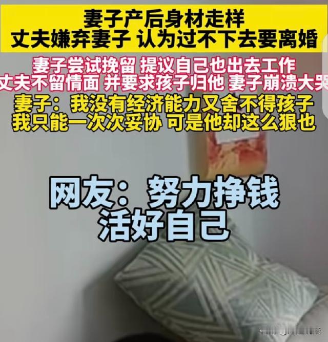 这种事可不在少数。一女子年轻时身材苗条,嫁给丈夫之后一心想要给他生娃。生产之后却身材走样,脸上也开始松弛下垂。丈夫看到她感到无比嫌弃,夫妻生活也说没了兴趣,然后就提出要离婚,实在过不下去了。根据女子了解,丈夫在外面已经有了外心,谈了个年轻的。女子哭诉想要挽留,甚至说愿意外出打工挣钱,但是丈夫不为所动,还让女子净身出户。 或许,婚姻中的女人,越是卑微,越是讨好,越是让丈夫瞧不起她。 然而现实生活中,这样的例子,也不在少数。 一女子在年轻的时候,身材也是非常出挑的,面容也姣好,所以她跟丈夫就陷入了爱河,之后就走进了婚姻的殿堂。 结婚之后,女子一心想要给丈夫传宗接代,没多久就怀孕了,之后就生下了小孩。 本来经历了一场生产的鬼门关,身体非常虚弱,作为丈夫,更加应该体谅妻子的苦。 可是,没想到这场渡劫,却遭到了丈夫的嫌弃。 生完孩子之后,女子原本苗条的身材,逐渐走了样。由于吃的比较多,女子的腰部甚至还多了几层赘肉。 再照照镜子,看看镜子里的自己,女子看到自己的脸蛋也是圆圆的,低头还能看到双下巴,甚至整个脸都是下垂松弛的。 不仅自己觉得不好看,丈夫更加是看在眼里,对眼前的妻子,表现得很不耐烦,同时还多了一些厌恶。 女子甚至还开始察觉,丈夫回家越来越晚,之后就像是变了一个人。 回到家,面对妻子,丈夫更加是拉长了脸,没有半点的开心,眼神里全都是嫌弃。 可能自此之后,丈夫完全就变心了,到了夜晚,睡觉距离妻子一米远,根本就不想进行半点夫妻生活。 日子就这样一天天的过了,妻子想要丈夫帮忙带孩子,丈夫直接就暴躁起来:“你自己看看你自己吧,不要说我好不好。你看看你的脸,还有你的身材,这日子我实在过不下去了。” 之后女子才知道,丈夫早就有了外心,他自己也承认,他想要离婚,想要跟婚外那个年轻的女人生活。 听到这话,女子直接一整个呆住了,简直不敢相信自己的耳朵。 “曾经对我很好的人,如今怎么能说出这么心狠的话?”女子非常伤心,一直在大声痛哭。 她想要挽留丈夫,她还承诺:以后她会出去打工,努力挣钱,帮助家庭减轻负担, 可是如今的丈夫,十头牛都拽不回他的心,他就像一块冷冰冰的石头,不为所动。甚至还主动说不要孩子,让妻子带着孩子走,让她净身出户。 嫁错了人,毁掉了一生,看看,这是否就是很现实的悲剧。 本案释法: 男子看到妻子成为黄脸婆就嫌弃,有了歪心想要跟年轻的女子结婚,甚至还提出不要孩子,让女子净身出户。如何评价这位男子的行为? 根据《民典法》规定,法律从未规定背叛感情的一方可以让另外一方放弃全部财产,法律不会支持感情的背叛者可以“零成本甩锅”。 妻子作为无过错方,甚至还可以主张多分配财产。根据《民法典》第1087条明确规定,当夫妻俩离婚的时候,分配财产时应该照顾无过错方、女方以及子女的权益。 而且,未成年孩子,不可以成为父母“要跟不要”的抉择,这是必选项,必须要承担的义务。根据《民法典》第1058条规定,父母对于未成年子女有共同抚养、教育、保护的义务,不得推诿。 如果这位丈夫提出不想要孩子,那么他提出的离婚诉求,相关部门则不会予以支持。 本案中的女子,因为给丈夫生孩子,身材走样,而且还遭受了生孩子的痛苦,作为丈夫应该给以体谅,不是说对方是黄脸婆,甚至还嫌弃,这种长期的贬低、冷暴力,会给妻子带来严重的精神痛苦,已经构成了“其他重大过错”。 所以说,这位丈夫,他有错。而妻子,她不该选择妥协。 本案例是否也给其他女性提醒了呢:嫁人之前,一定要擦亮眼睛,要看清对方的人品。 还有就是,女人可不能因为孩子就失去自我,要有自己的事业,有自己的生活和追求,这样才能在婚姻里有话语权。 嫁错人,暗淡的生活,最后可能真的就是毁了自己一辈子。 对此,您怎么看呢?
