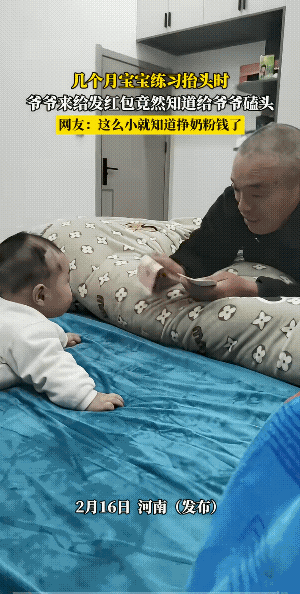 宝宝高兴,爷爷乐。 几个月的宝宝,他竟然知道爷爷是让他磕头得压岁钱的。 小宝宝也乐此不惫……