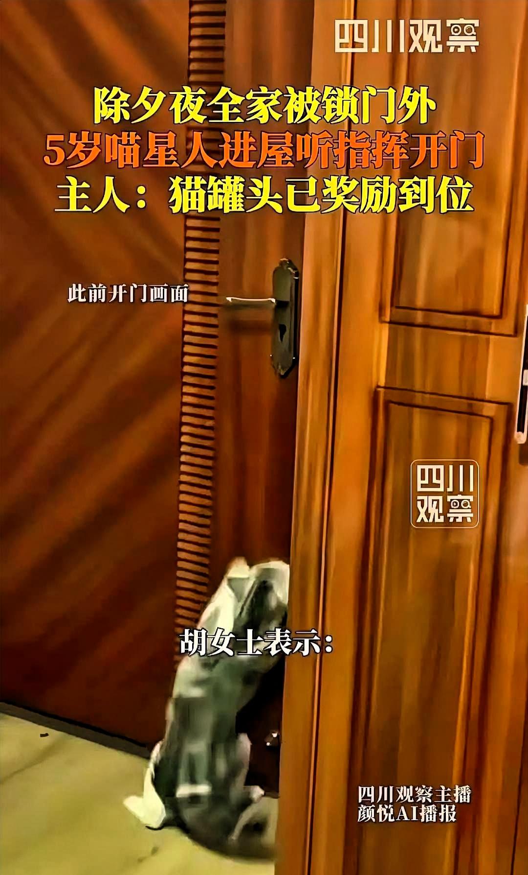 “立大功了!”湖北宜昌,除夕夜全家出门吃饭,中途返回拿东西,才发现钥匙被锁在了家里,五个人都被关在门外。 大过年的,开锁师傅大多已经放假,一时之间根本找不到人帮忙,一家人站在楼道里,十分着急。 就在大家一筹莫展的时候,家里养了五年的小猫刚好回来。主人灵机一动,想到小猫平时可以从小窗户进出,便试着把猫从窗户送进屋里,希望它能帮忙打开房门。一开始大家也只是抱着试一试的想法,没想到猫咪十分配合,在家人的轻声指引下,真的成功打开了门锁。 短短几分钟,原本棘手的问题就被一只小猫解决了,全家人都松了一口气。不少人觉得猫咪高冷独立,可真正长期相处下来就会发现,小动物虽然不会说话,却能和主人形成无声的默契。五年的朝夕相处,让它熟悉家里的环境,也懂得主人的意图,在关键时刻帮上了大忙。 这件事被分享到网上后,很多网友都觉得又暖心又有趣。大家纷纷表示,这才是真正用心养出来的宠物,平时的陪伴没有白费。主人也给小猫奖励了猫罐头,当作对它的感谢。 其实宠物带给我们的,不只是日常的陪伴,还有很多意想不到的温暖与帮助。它们用最简单直接的方式,默默守护在身边,成为家庭里不可或缺的一员。平凡生活里的这些小美好,往往最能打动人心。