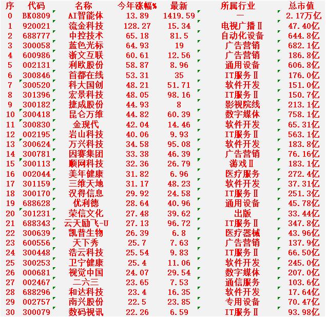 AI智能体概念,2026年以来涨幅最多的30名单汇总一览 流金科技:今年涨幅 +128.27%,最新价 15.34元,总市值 47.40亿元 中控技术:今年涨幅 +65.18%,最新价 81.50元,总市值 644.8亿元 蓝色光标:今年涨幅 +64.93%,最新价 19.00元,总市值 682.1亿元 浙文互联:今年涨幅 +60.61%,最新价 12.56元,总市值 186.8亿元 利欧股份:今年涨幅 +58.87%,最新价 8.96元,总市值 606.8亿元 首都在线:今年涨幅 +53.31%,最新价 35.00元,总市值 176.0亿元 科大国创:今年涨幅 +48.21%,最新价 51.71元,总市值 151.0亿元 宏景科技:今年涨幅 +48.05%,最新价 98.16元,总市值 150.7亿元 捷成股份:今年涨幅 +44.93%,最新价 8.00元,总市值 213.1亿元 昆仑万维:今年涨幅 +44.82%,最新价 60.39元,总市值 758.1亿元