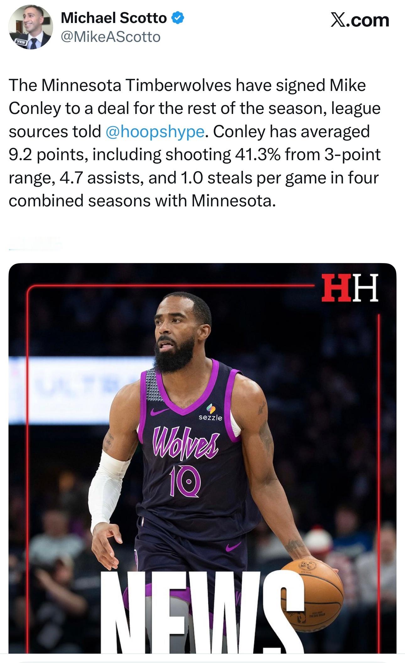 Michael Scotto:森林狼与老将康利签约至本赛季结束。在明尼苏达的四个赛季,康利场均9.2分4.7助攻1.0抢断,三分命中率41.3%。