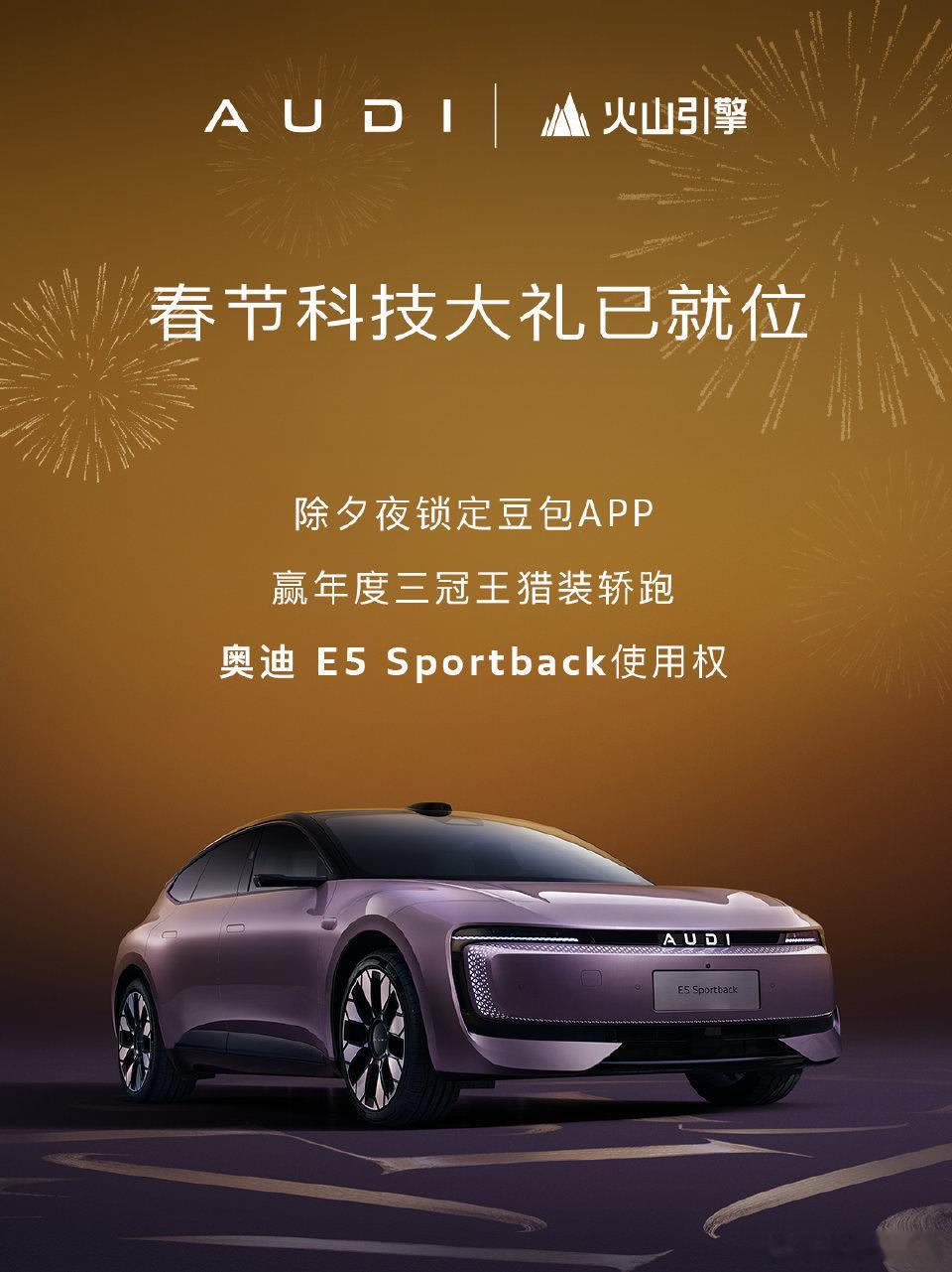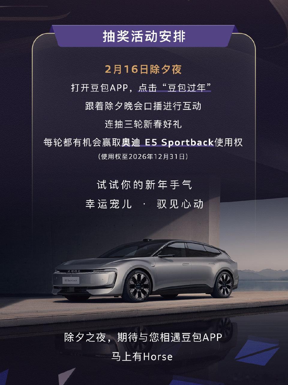 奥迪抽奖送车除夕福利返场 马年春节最有诚意的互动福利,AUDI必须算一个。继除夕豆包与春晚合作送出的奥迪E5 Sportback使用权外,AUDI大年初一返场福利继续加码,新车使用权、明星签名照和购车抵用权益统统安排上,让更多人有机会感受这款车型。