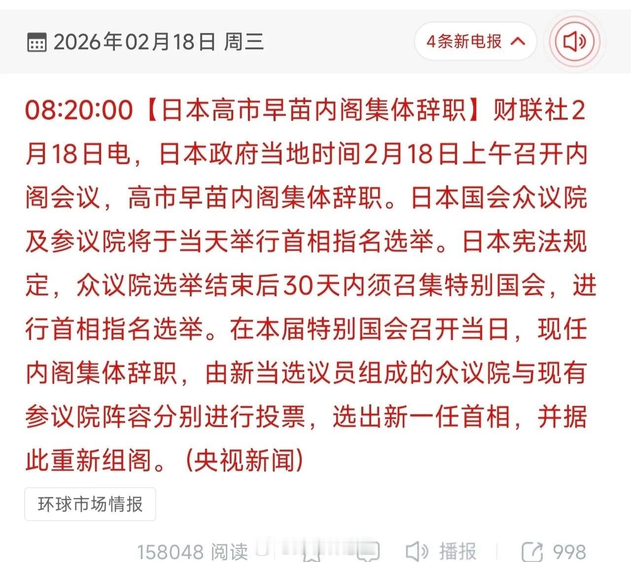 2026年2月18日,日本高市早苗内阁因众议院选举后按宪法流程集体辞职,新首相将由特别国会选出并组阁。这一事件将重塑日本国内经济、贸易、能源及外交政策,对中日产业链合作、汽车与半导体供应链、能源进口结构等产生深远影响。相关板块如跨境贸易、国产替代、能源转型、农产品安全等迎来机遇,A股相关概念股或受益于政策预期与产业格局变化。个股梳理分析1. 中远海控:跨境物流龙头,受益于中日贸易格局变化,若日本新内阁调整对华贸易政策,跨境物流需求或波动,公司凭借全球航线网络与运力优势,有望把握贸易结构调整带来的业务增量。2. 上港集团:上海港是中日贸易核心枢纽,若日本新内阁调整贸易政策,港口吞吐量与集装箱业务或受影响,公司作为国内港口龙头,具备抗风险能力与业务拓展空间。3. 东方航空:中日航线核心航司,若日本新内阁调整出入境政策,航空客运需求或变化,公司凭借航线网络与运营能力,有望把握政策调整带来的客运业务机遇。4. 广汽集团:日系车在华供应链核心企业,若日本新内阁调整汽车产业政策,国产替代进程或加速,公司凭借自主研发与合资合作,有望抢占市场份额。5. 比亚迪:新能源汽车龙头,受益于日系车供应链波动带来的国产替代机遇,公司凭借技术优势与产能布局,在全球新能源汽车市场竞争力持续提升。6. 中芯国际:半导体制造龙头,若日本新内阁调整半导体出口管制政策,国产替代进程或加速,公司凭借先进制程与产能扩张,有望填补供应链缺口。7. 北方华创:半导体设备龙头,受益于日本半导体设备出口限制带来的国产替代机遇,公司凭借刻蚀、PVD等核心设备技术,在国内晶圆厂渗透率持续提升。8. 沪硅产业:半导体硅片龙头,若日本新内阁调整硅片出口政策,国产硅片需求或增长,公司凭借大尺寸硅片产能与技术突破,有望抢占国内市场份额。9. 长电科技:半导体封测龙头,受益于半导体供应链重构带来的封测需求增长,公司凭借先进封装技术与全球布局,在国产替代进程中占据先发优势。10. 中国核电:核电龙头,若日本新内阁调整能源政策,重启核电或调整核电出口,国内核电建设或加速,公司凭借核电运营与项目储备,有望受益于能源转型。11. 隆基绿能:光伏龙头,若日本新内阁调整能源转型政策,加大光伏装机,国内光伏产品出口或增长,公司凭借技术优势与全球产能,有望抢占日本市场份额。12. 宁德时代:储能龙头,受益于日本能源转型带来的储能需求增长,公司凭借储能电池技术与产能布局,在全球储能市场竞争力持续提升。13. 大北农:农产品龙头,若日本新内阁调整农产品进口政策,国内农产品替代进口需求或增长,公司凭借种业与养殖技术,有望受益于粮食安全战略。14. 金龙鱼:粮油龙头,若日本新内阁调整粮油进口政策,国内粮油替代进口需求或增长,公司凭借产业链一体化与品牌优势,有望抢占市场份额。15. 中国银行:跨境金融龙头,受益于中日贸易与汇率波动带来的跨境金融需求,公司凭借全球网络与金融产品,在跨境结算、贸易融资等领域占据优势。16. 招商银行:财富管理龙头,若日本新内阁调整金融政策,跨境资产配置需求或变化,公司凭借财富管理能力与客户基础,有望把握跨境金融机遇。17. 三一重工:工程机械龙头,若日本新内阁调整基建政策,国内工程机械出口或增长,公司凭借技术优势与全球布局,在海外市场竞争力持续提升。18. 万华化学:化工龙头,若日本新内阁调整化工品出口政策,国产化工品替代进口需求或增长,公司凭借MDI等核心产品技术与产能,有望抢占市场份额。总结日本高市早苗内阁集体辞职后,新内阁的政策走向将重塑中日产业链与全球产业格局,跨境贸易、国产替代、能源转型、农产品安全等板块迎来机遇。相关概念股凭借技术壁垒、产能布局与生态合作,有望受益于政策预期与产业结构变化,行业长期增长空间广阔,需关注新内阁政策落地后的实际影响。本文涉及资讯、数据等内容来自网络公共信息,仅供参考,不构成投资建议!