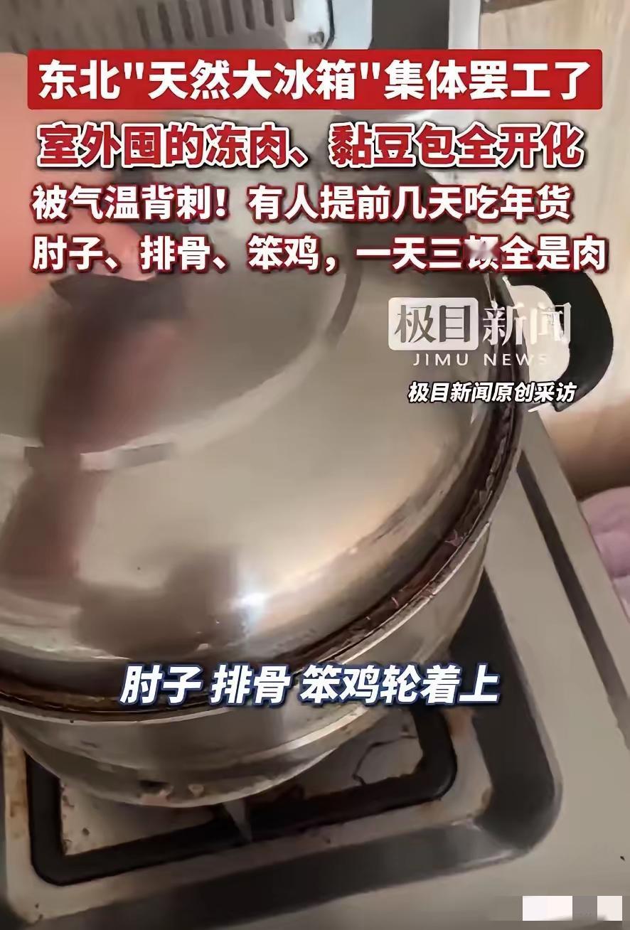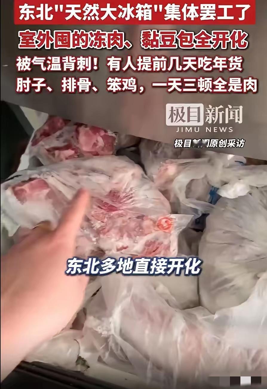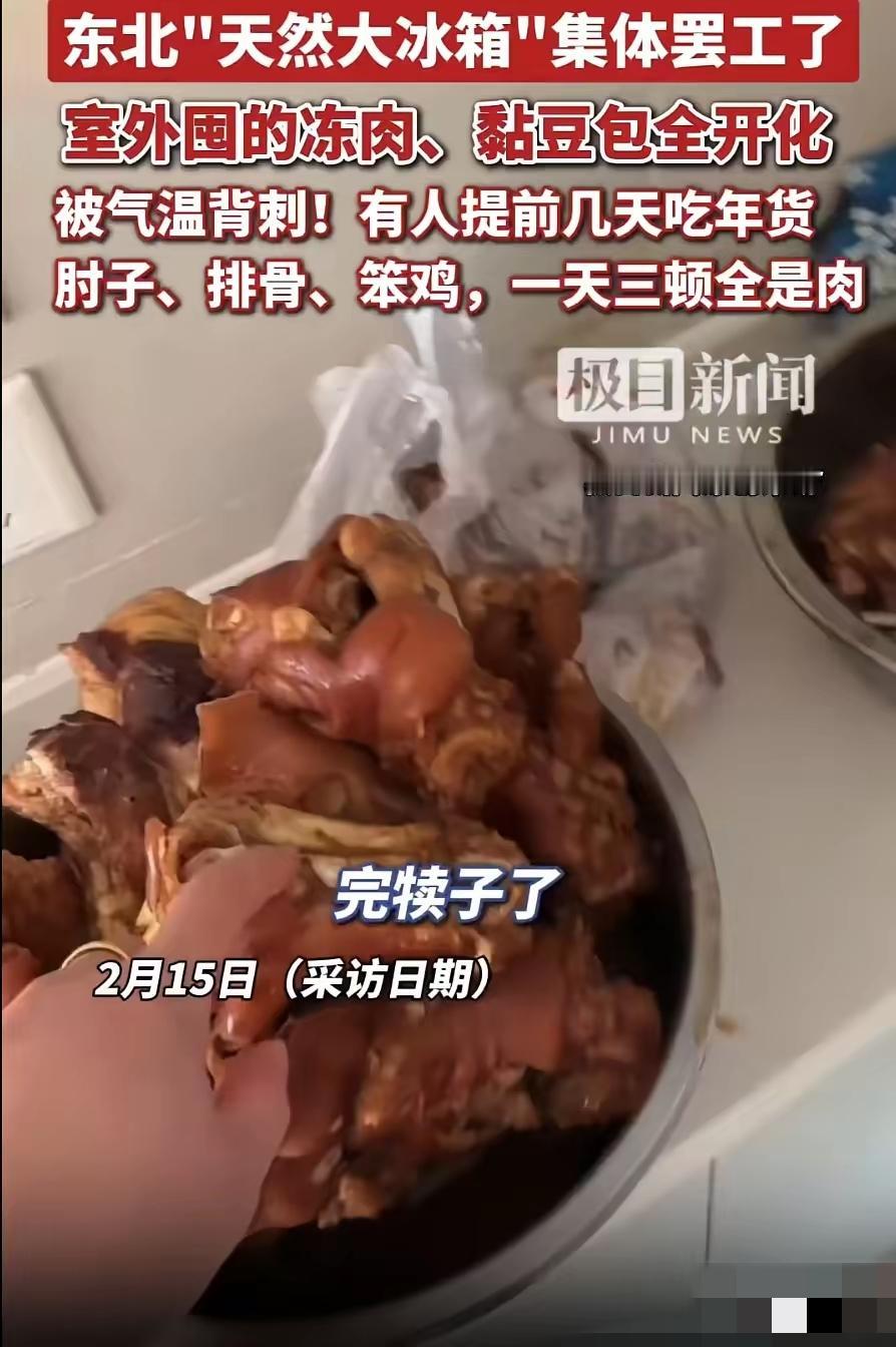 千算万算没算到天气!2月15日,吉林长春的于女士,过年在家囤了足足500斤年货,本来以为和往年一样,往院子里、阳台上一放,靠着东北的严寒当天然大冰箱,就能安安稳稳放到开春,结果今年气温一个劲往上升,外面彻底冻不住了,全家现在一天三顿饭顿顿吃肉,卯足了劲消耗,可那堆年货还是不见少,急得一家人团团转。 2026年长春,于女士盯着院里正在“渗水”的500斤年货,冷汗直流。曾是体面象征的肉山,在反常暖冬下正沦为发臭的“定时炸弹”。当天然冰箱意外罢工,一场与时间的生死时速正式拉开:是强行塞进全家人的胃,还是眼睁睁看着万元家底腐烂?这场“肉食劫难”,让春节变成了生理极限的残酷挑战。 二月的长春,温度计仿若一位爱打趣的顽童。那刻度上跳动的数字,好似在与人们诙谐戏谑,让人真切领略到这座城独特的“冷”幽默。 于女士站在自家院子里,盯着金属置物架上那堆正在"苏醒"的冻肉,心里五味杂陈。往年这个时候,这些肉块硬得能当砖头使,今年倒好,表面泛着黏腻的水光,用手一摁,软得让人心慌。 五百斤。整整五百斤年货,正在以肉眼可见的速度走向失控。 这事儿得从半个月前说起。春节前,于女士按照保持了十多年的老规矩,把农贸市场和亲戚家跑了个遍。猪牛羊肉、整鸡整鸭、冻鱼、风干肠、粘豆包、酸菜、冻梨冻柿子——东北人过年该有的排场,一样没落下。 采购完毕,她把这些宝贝分门别类:大块生鲜往院子的架子上一摆,速冻食材和腌菜往阳台角落一堆,齐活。 既未启用冰箱储存,也未进行真空包装处理,甚至在包装方面都懒于多费一分心力,连一层塑料袋都吝于多裹。 凭什么这么豪横?凭的是长春零下二十度的老天爷。于女士践行这套“天然冰箱”理论已逾十载,在漫长时光里,它始终稳定可靠,未曾出现任何差池,宛如一位忠诚的伙伴,默默守护着生活的秩序。 然后,2026年的马年春节,老天爷翻脸了。 气温比往年同期高出将近五度,白天最高温蹿到零上五度,晚上也不怎么冻。昼化夜冻,冻了又化,反复折腾之下,那些原本能安稳躺到开春的年货,集体"叛变"了。 大年初二,于女士例行检查库存,差点没站稳。冻鱼软塌塌地瘫在那儿,粘豆包黏成了一坨分不开,酸菜缸里飘出一股不太对劲的味道。 五百斤的"安全感",瞬间变成了五百斤的"定时炸弹"。 怎么办?吃。拼命吃。 从初三开始,于女士家的餐桌彻底沦陷。早餐炖肉,午餐炒肉,晚餐酱骨架。蔬菜?大抵只需作些许点缀便足矣。它并非饮食的主调,无需过多着墨,稍微添之,便也能为餐食增添别样韵致。米饭?能少吃就少吃,把胃容量留给正事儿。 一家五口轮流下厨,煎炸烹煮焖溜熬炖,能想到的做法全上了一遍。亲戚来拜年,二话不说,坐下吃肉。 十余日转瞬即逝,全家人的面容皆笼上一层阴霾,神色尽显憔悴与忧虑,不复往日的明朗。平时饮食清淡的成员开始闻肉色变,筷子伸向盘子的动作越来越迟疑,但没办法,硬着头皮也得往下咽。 此般景况,哪能称得上是过年?分明似在渡劫。年节本应喜乐融融,如今却满是艰难,这反差,着实令人感慨。 光靠吃显然不够。于女士把家里的冰箱冰柜塞得满满当当,又厚着脸皮借了亲友的闲置冰柜。听说邻居把存不下的东西塞进了汽车后备箱,她也有样学样,把自家车变成了临时冷库。 实在消化不了的,干脆送人。邻居、同事、朋友,谁要给谁,品相好的先挑走,别客气。 曾经的"囤货大户",如今成了"散财童子"。 于女士的遭遇不是个例。轻启手机,随意滑动屏幕,映入眼帘的尽是东北网友的声声悲叹,满屏皆是他们饱含无奈与痛苦的哀嚎之音。"我家也囤了一百多斤,天天吃肉吃到想吐。""囤年货变成抢年货,抢着吃完那种。""东北的天然冰箱今年彻底下岗了。" 2026年这个暖冬,把多少东北家庭的老经验打了个措手不及。 零下二十度的日子,大家习惯了。习惯到忘了问一句:万一哪天不冷了呢? 于女士家的五百斤年货,到现在还没见底。厨房里的锅灶依旧热火朝天,餐桌上的肉盘依旧堆得冒尖,一家人依旧在和时间赛跑。 这场战事何时能尘埃落定,实难断言。战火的走向变幻莫测,每一刻都充满未知,究竟何时能迎来终章,无人可给出确切答案。 但有一件事是确定的:明年过年,于女士说什么也得先看看天气预报再囤货。 老天爷靠不住了,还是冰箱实在。