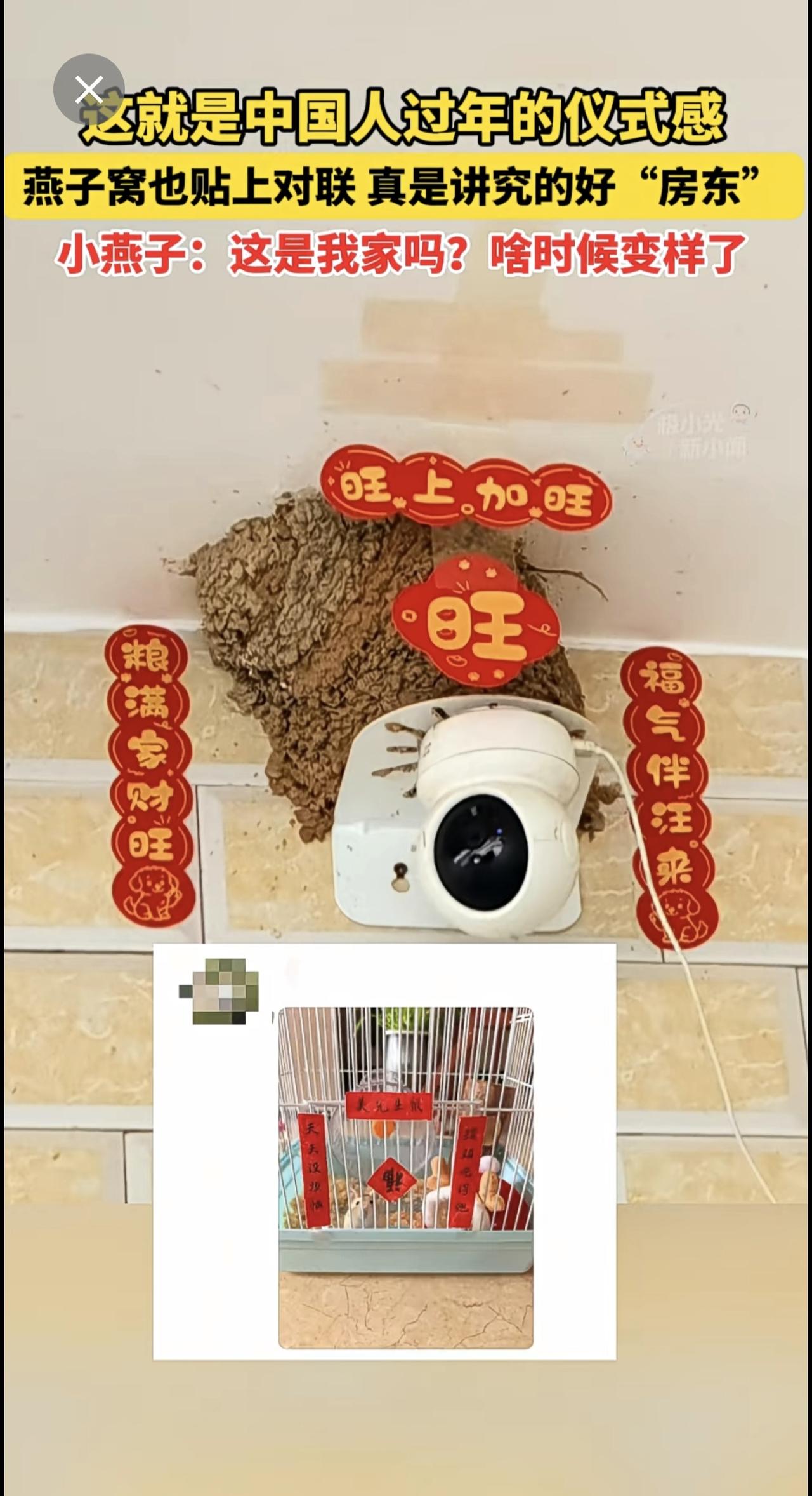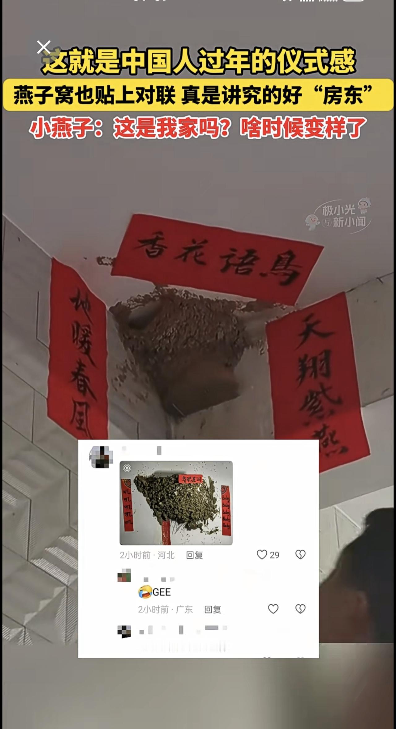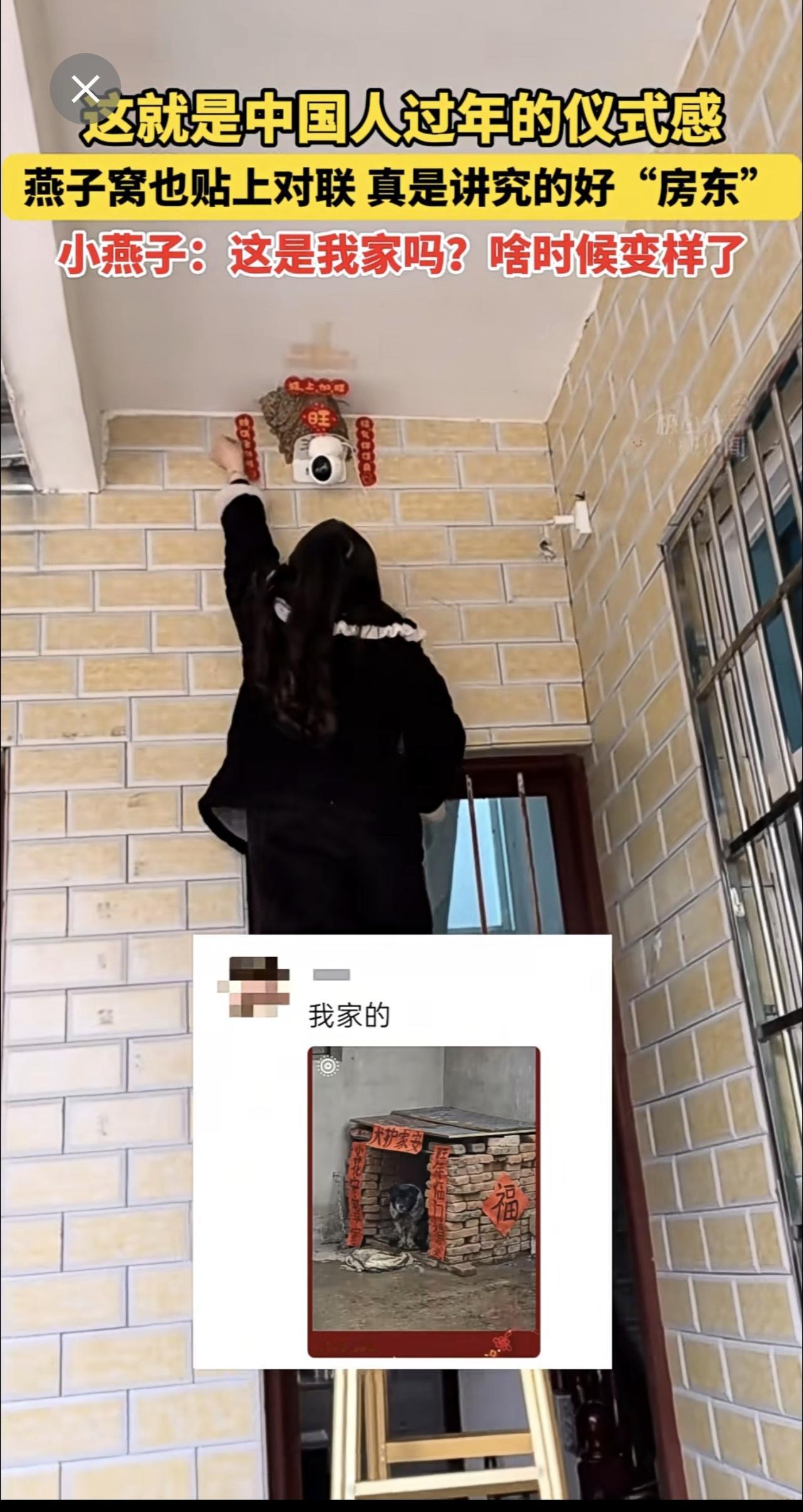 2月16日,这就是中国人过年的仪式感!燕子窝也贴上对联,真是讲究的好“房东”!小燕子:这是我家吗?啥时候变样了