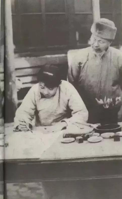 这张照片记录了国画大师齐白石指导侧室胡宝珠作画的珍贵瞬间。 照片中这位年轻的女子,正是刚嫁入齐家不久的胡宝珠。她正伏案凝神,手持毛笔在纸上创作,神情专注而认真。此时的她年仅18岁,却已展现出对绘画的浓厚兴趣与天赋。 齐白石站在她身后的老者,是57岁的齐白石。他头戴棉帽,身着传统长衫,目光注视着胡宝珠的笔触,仿佛在悉心指点。这位日后的国画泰斗,此时正耐心地将自己的毕生所学,传授给这位年轻的伴侣。