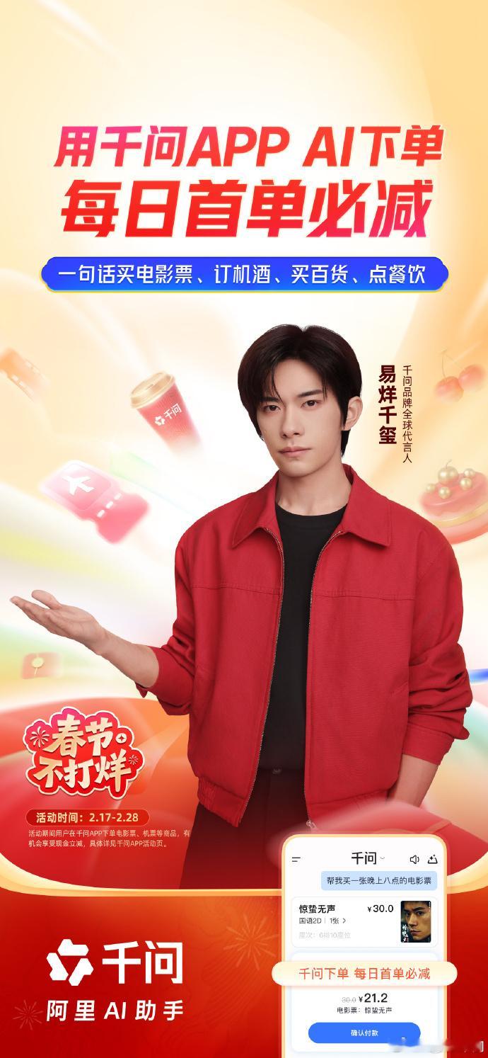用千问一句话下单每日首单必减千问APP春节不打烊,推出“每日首单必减”活动。用户用一句话下单电影票、机酒、百货、餐饮等,均可享受首单立减优惠。