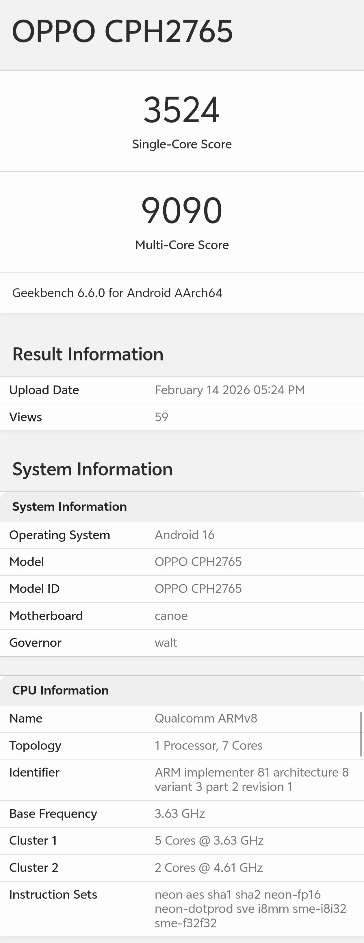 –型号 CPH2765–搭载骁龙 8 Elite Gen5 处理器,4.61GHz 超大核,单核 3524分,多核 9090分(似乎是降频版)