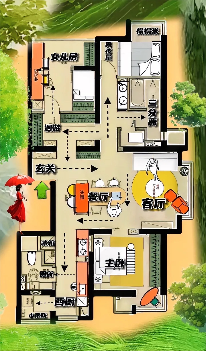 即使没玄关,两条洄游动线,一点儿不矫情,尤其是收纳小洄游,用隐形门的手法,给两娃创造,有趣的活动室,兼收纳的意务!